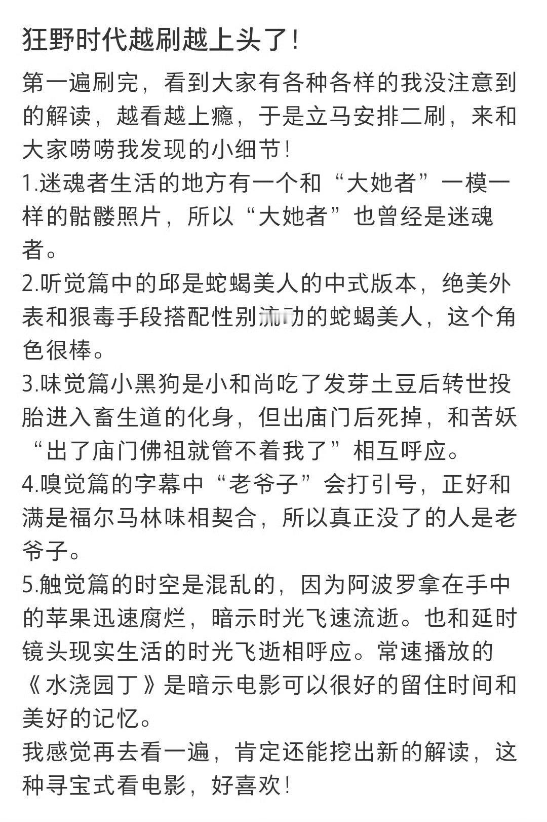 狂野时代细节挖不完根本挖不完《狂野时代》构建执念闭环,六大篇章如费纳奇镜般首尾相连。视觉听觉味觉嗅觉触觉,每一重感官都是命运的伏笔