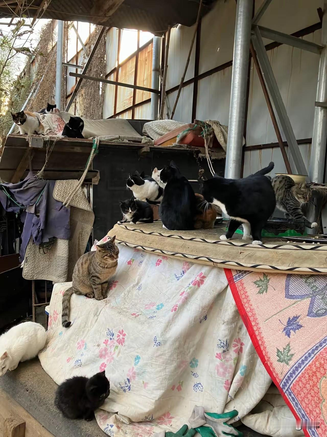 她让师傅弄了一个很大的棚,防止雨水,然后又给猫咪们弄了几个可以休息的猫窝和猫垫,