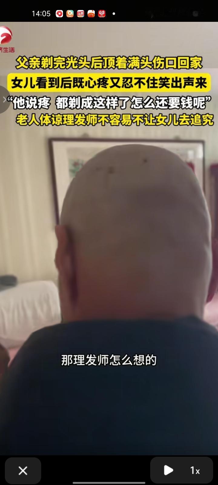 11月29日,天津。女子发视频表示,父亲剃完光头后顶着满头伤口回家看了既心疼又笑不出声来。问他当时剃头发时有没有感觉,他说疼,这也不知道理发师是怎么想的,剃成这样怎么还要钱呢,现在父亲头上的伤口用创可贴贴上了,感受到理发师的不易就不追究。