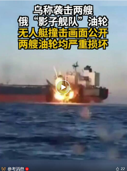 据参考消息援引英国《每日电讯报》网站11月29日报道,乌克兰方面称,其使用无人艇袭击了两艘与俄罗斯“影子舰队”有关的受制裁油轮。