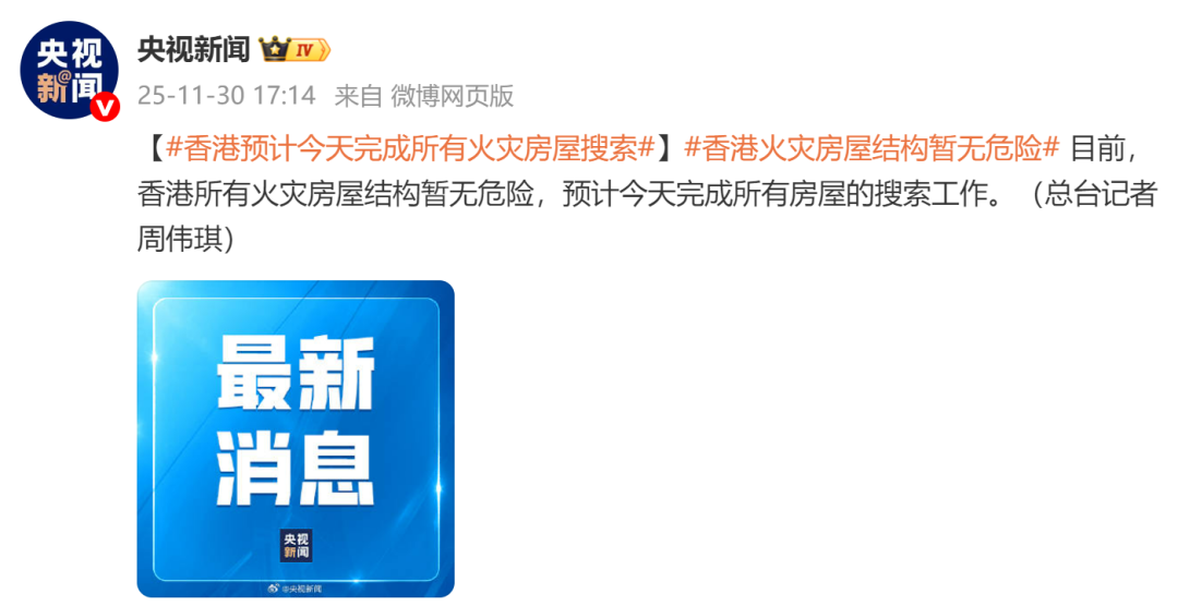 据央视新闻最新消息:目前,香港所有火灾房屋结构暂无危险,预计今天完成所有房屋的搜索工作。
