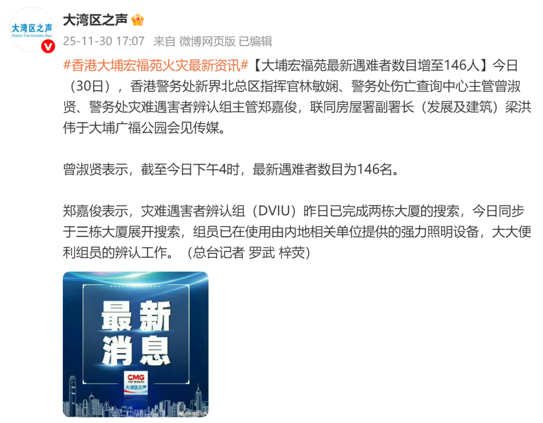 11月30日,香港警方举行新闻发布会。警方表示,截至当天16时,大埔宏福苑火灾已造成146人遇难,仍有100名受灾人员失联。大火搜救工作仍持续进行。