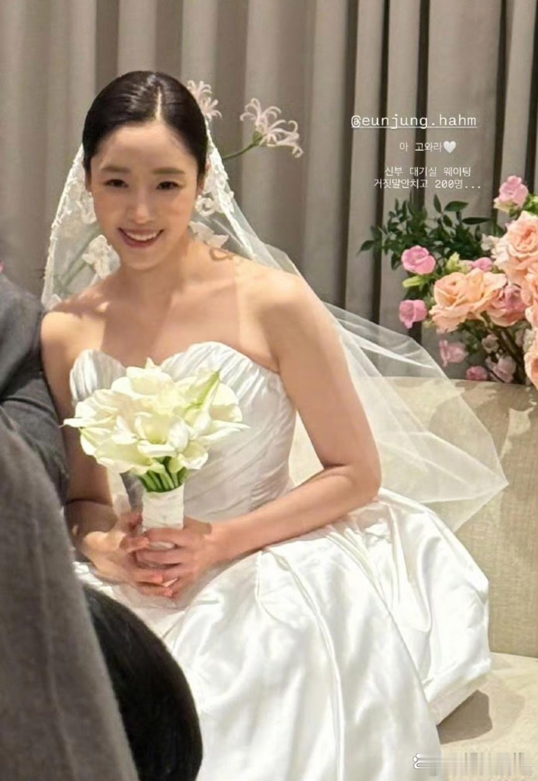 咸恩静婚礼30日,咸恩静和导演金秉宇举行婚礼,视频中咸恩静一袭白色抹胸长裙,挽着