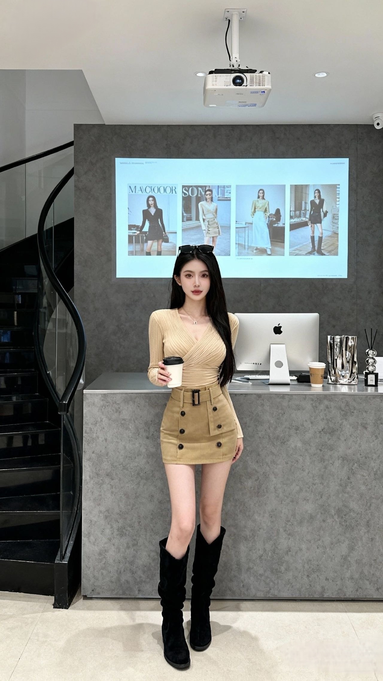 这件卡其交叉针织衫真的绝——V领+收腰,显瘦到连我妈都问“是不是偷偷减肥了”!配同色系双排扣短裙,腰带一勒,腰臀比直接封神~
