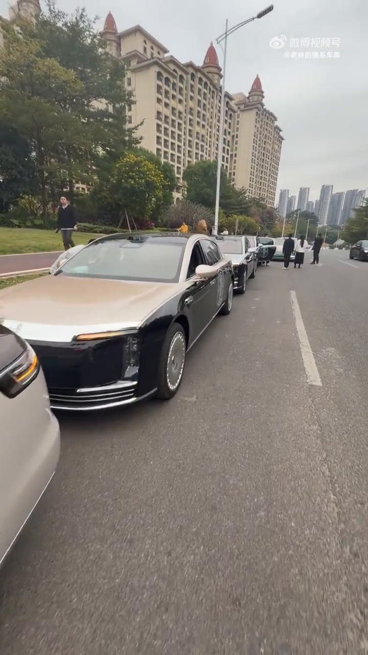 尊贵的s800车主,十几排,这里一个车队,什么颜色都有了,基本上这个才刚上牌。大家看一下总共有多少台,什么颜色都给我们包齐了。华尊会的标志,看一下标志,大家数一下一共多少台。还有一个在最后面,跟我一样有品位的就三台,黑金,贴反了,这个轮毂有点帅,比大比轮毂帅。