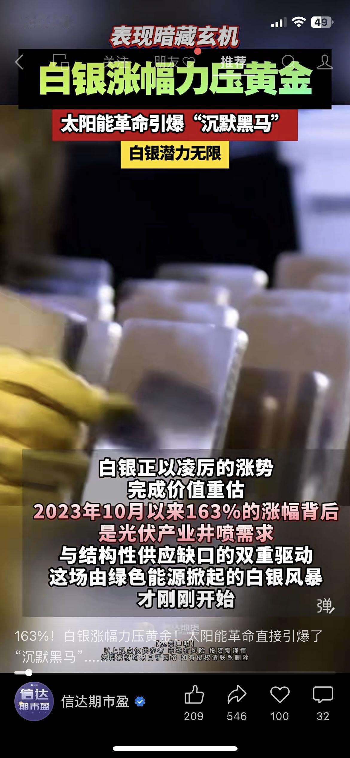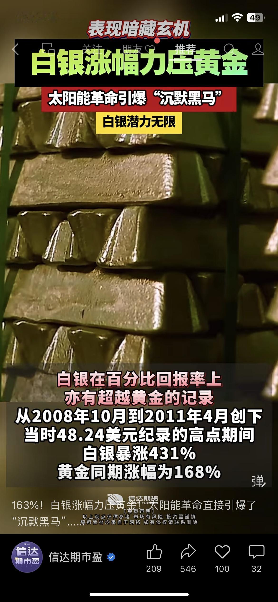家人们!这匹“沉默黑马”杀疯了!白银涨幅直接力压黄金,还没关注的赶紧看! 从2023年10月到现在,白银价格直接涨了163%!为啥这么猛?核心就两点:一是光伏产业爆了,太阳能板生产对白银的需求疯涨(白银是优质导电材料);二是全球白银供应紧张,供需缺口直接把价格抬飞! 而且这不是白银第一次“超车”:2008-2011年那波牛市,白银直接涨了431%,同期黄金才涨168%,爆发力绝了! 现在光伏革命还在火,这波白银的“价值重估”怕是才刚开始…你们有入手白银(期货/基金/实物)的吗?觉得这波行情能持续多久?白银 黄金 理财 光伏产业白银 黄金白银价格