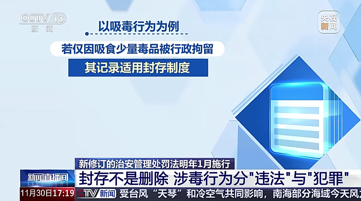 11月30日,据央视新闻消息:治安违法记录封存针对的是“尚不构成刑事处罚”的行政违法行为,走私、贩卖毒品构成犯罪,需纳入刑事犯罪记录管理,不适用封存规则。