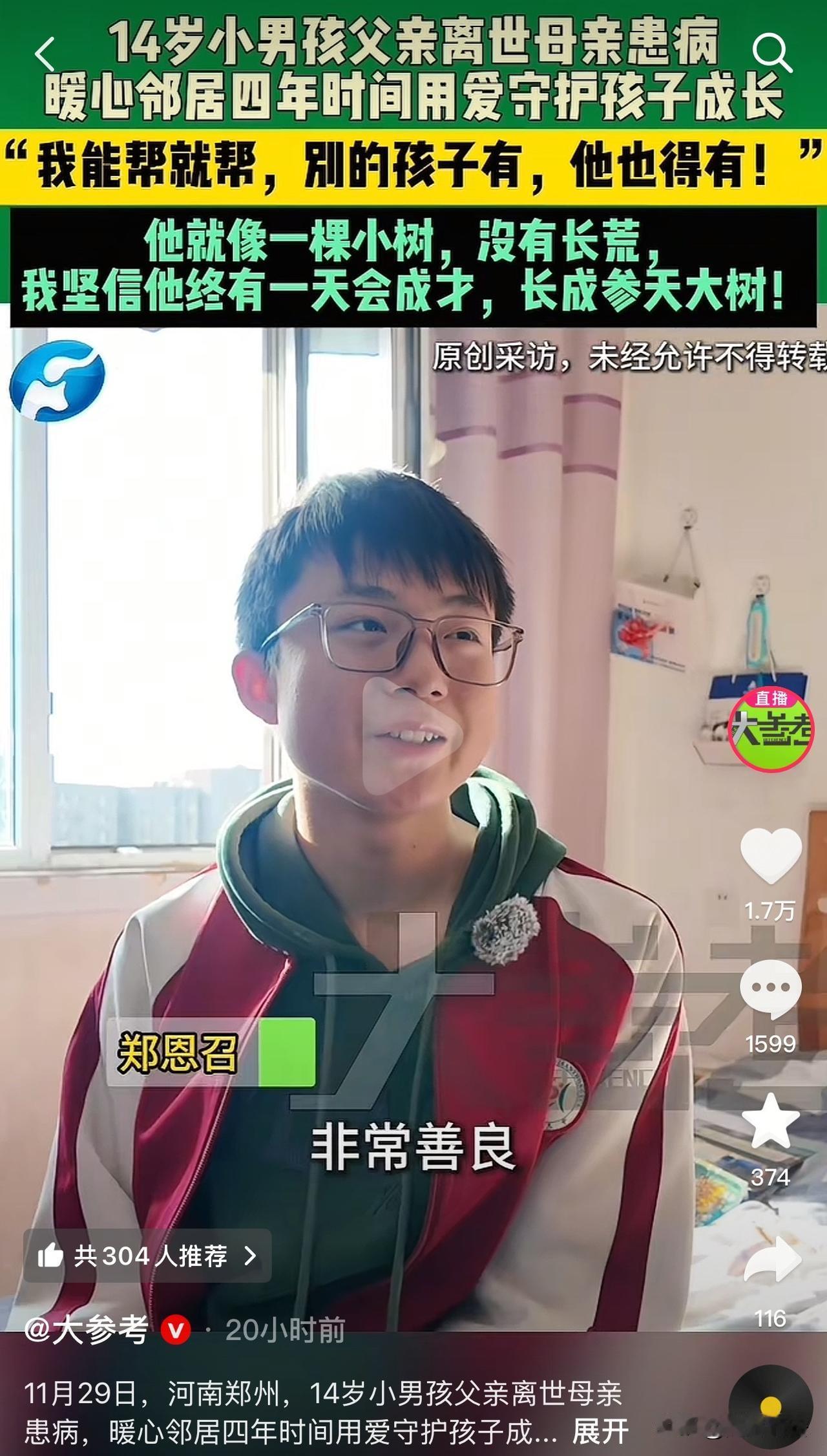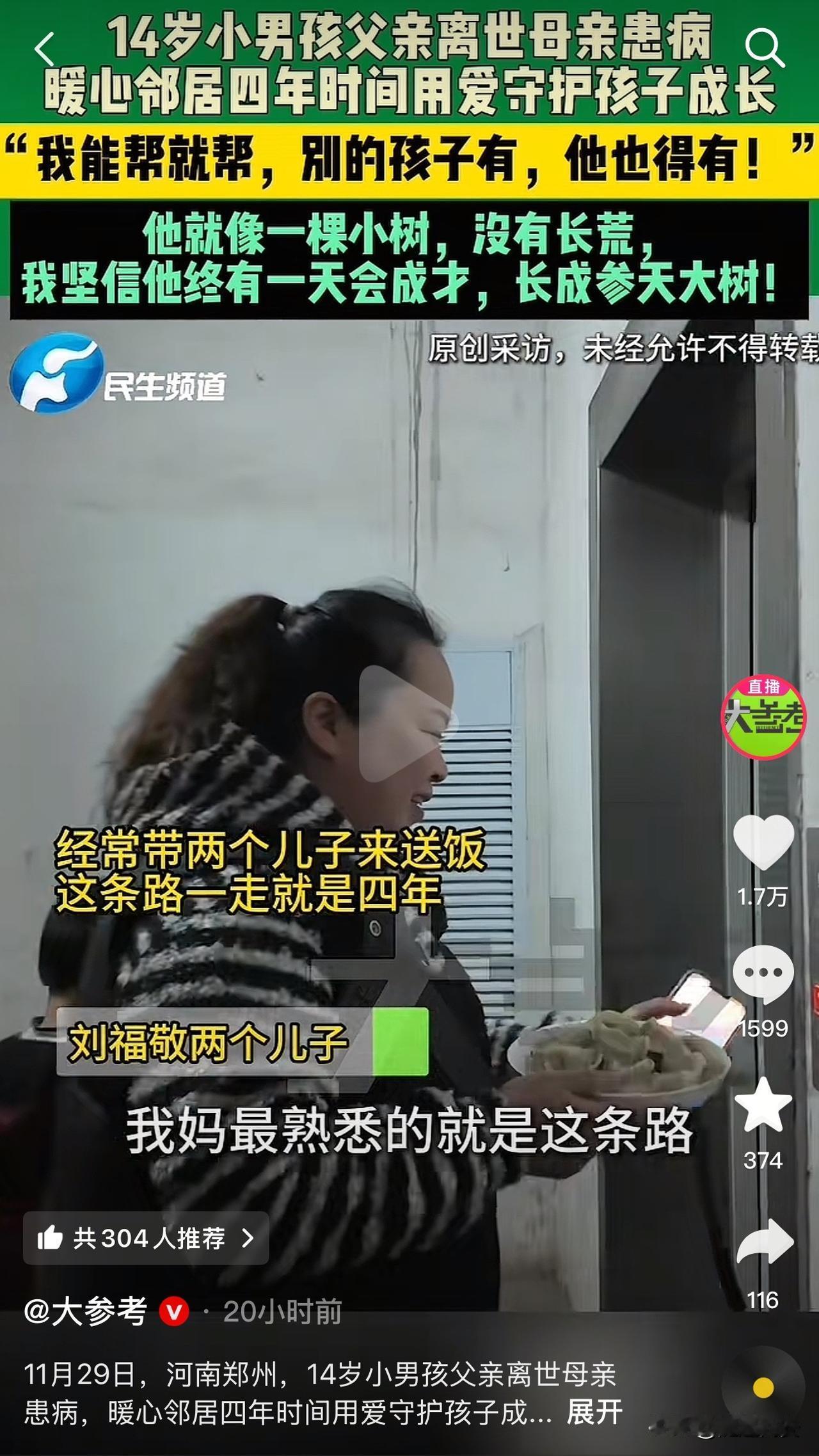 太感动了!河南郑州一名14岁的男孩父亲因脑梗去世,母亲患病,而他的邻居则带着两个儿子经常给其送饭,一送就是四年。女子称,自己能帮就帮,别的孩子有,他也得有。目前男孩学习成绩优异,一学期就拿了4个单科状元! 据女子称,她是看着孩子长大的,再加上自己也是个妈妈,当看到他家有难处,就不忍袖手旁观,更不想让孩子吃苦,所以她能帮就帮。 平时她做完饭都会带两个孩子去送饭,这条路一走就是4年,她的儿子笑着说:“我妈最熟悉的就是这条路。” 男孩说,她非常善良,更像是自己的亲人,除了日常照料,自己学习上需要的材料,她都会第一时间送到。他表示自己会努力学习,将来也想帮助别人。 “远亲不如近邻”这句话在此刻具象化了。善良的妈妈,做了很多亲人都无法做到的事情。 其实,这绵延的善意早已超越简单帮扶,化为润物无声的陪伴。她以最朴素的行动诠释“幼吾幼以及人之幼”的深意—,让缺失庇护的男孩在爱中完整。 更可贵的是,这份善良在孩子们心中生根发芽:她的儿子学会共情,受助男孩立志反哺。 世界破破烂烂,总有人用心缝补!