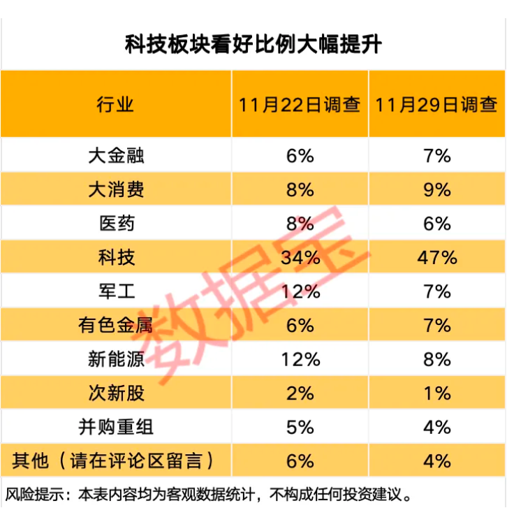 对于下周A股市场的潜力板块和方向选择,科技板块看好比例大幅提升,环比提升13个百分点,最新为47%,是受访者下周最为看好的板块;军工、新能源板块看好比例分别环比下降5个百分点、4个百分点,最新分别为12%、4%,降幅较大。