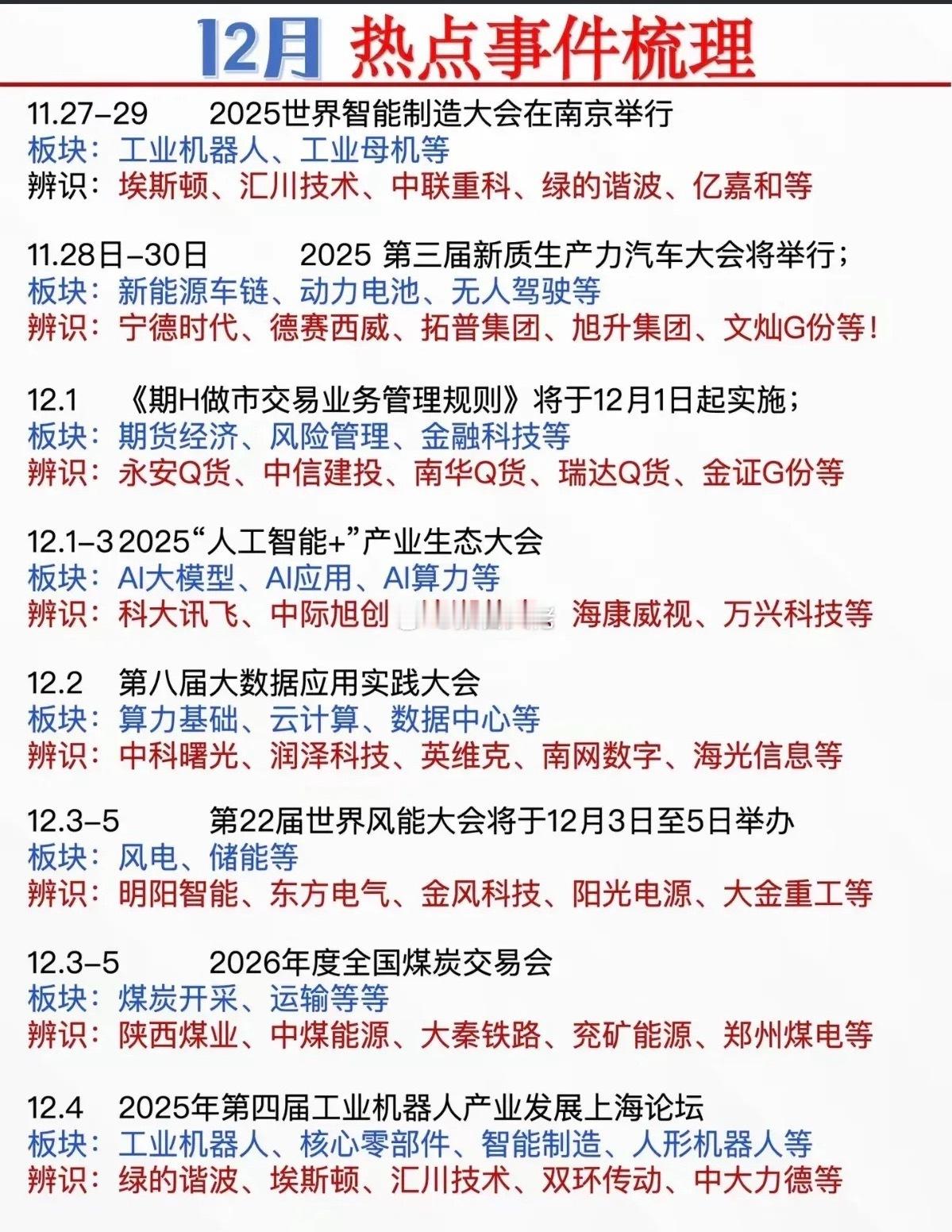 2025年12月热点事件个股梳理多集中在AI与算力、新能源与资源、消费与出行、高端制造与基建、医药与医疗等政策及事件利好赛道,以下是部分代表性标的:1. AI与算力赛道:新易盛(CPO算力硬件核心标的,适配AI算力需求)、海康威视(计算机领域龙头,受益AI安防及企业级应用)、寒武纪(AI芯片代表性企业,贴合算力产业发展大会热点)、三六零(AI安全与网络安全龙头,同时适配“人工智能+”产业生态大会题材)。2. 新能源与资源赛道:恩捷股份(全球湿法隔膜龙头,绑定宁德时代等头部电池企业)、永太科技(电解液领域领先,氧化物电解质适配蔚来固态电池)、中国神华(煤炭开采龙头,受益12月全国煤炭交易会带来的行业预期)、大金重工(风电设备核心标的,契合世界风能大会热点)。3. 消费与出行赛道:中国国航(交运领域券商推荐标的,叠加中国航线发展大会利好)、李宁(纺服行业重点推荐,适配内需回升趋势)、贵州茅台(白酒龙头,受益《陈年白酒流通鉴定规范》实施带来的行业规范利好)、中国中免(冰雪经济人气标的,契合冬季旅游消费热潮)。4. 高端制造与基建赛道:恒立液压(机械领域券商金股,适配设备投资修复趋势)、上海港湾(海外基建龙头,深耕“一带一路”岩土工程业务)、龙溪股份(关节轴承龙头,适配军工及工程机械需求)、合肥城建(承接长鑫存储基建项目,兼具半导体基建与地产复苏双重逻辑)。5. 医药与医疗赛道:甘李药业(医药生物领域券商推荐标的)、创新医疗(脑机接口大会核心人气股,贴合未来产业集聚区建设题材)、高视医疗(港股眼科器械龙头,OK镜获批预期强)、华润三九(契合中国医药高质量发展大会热点的医药龙头)。