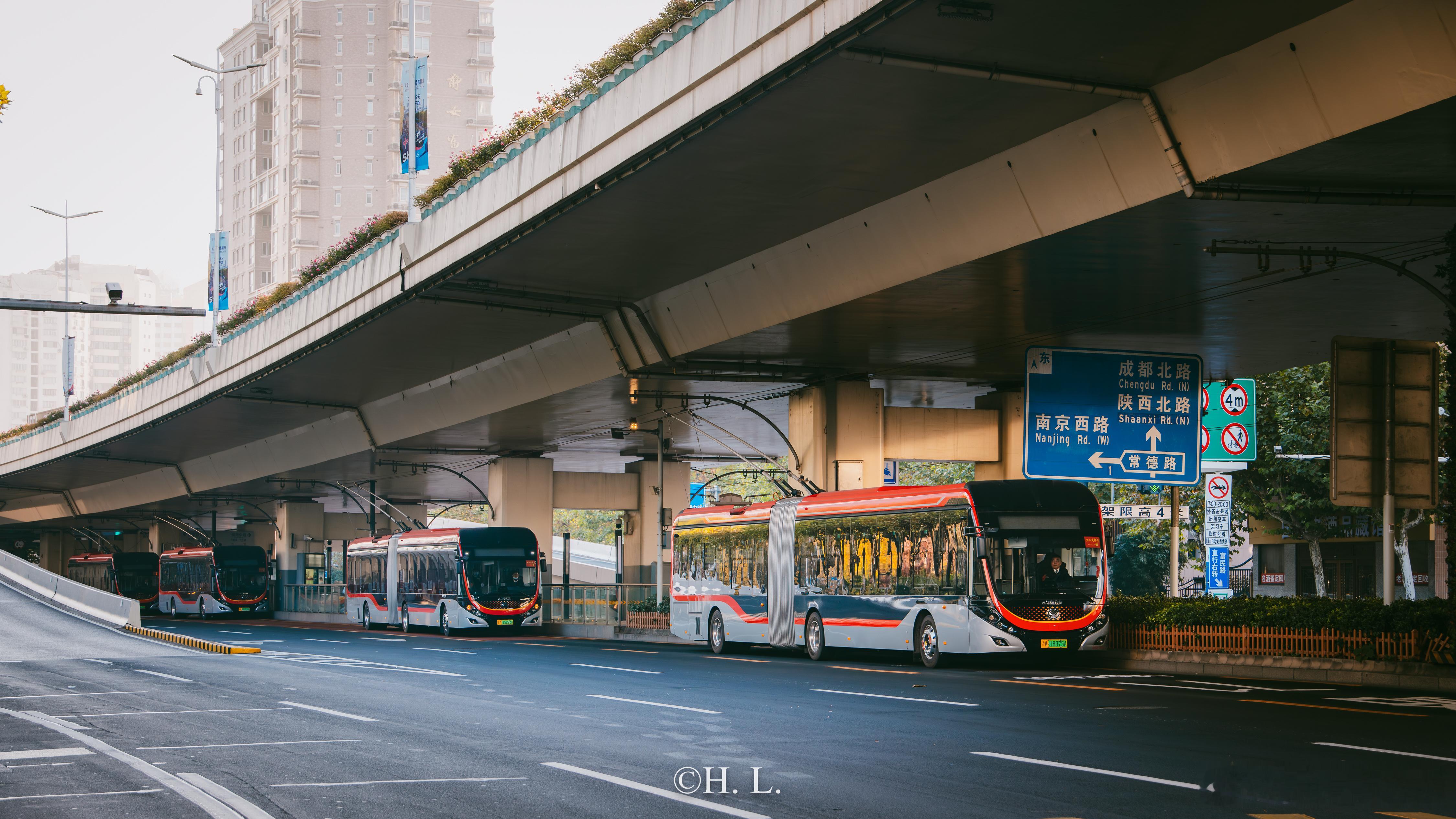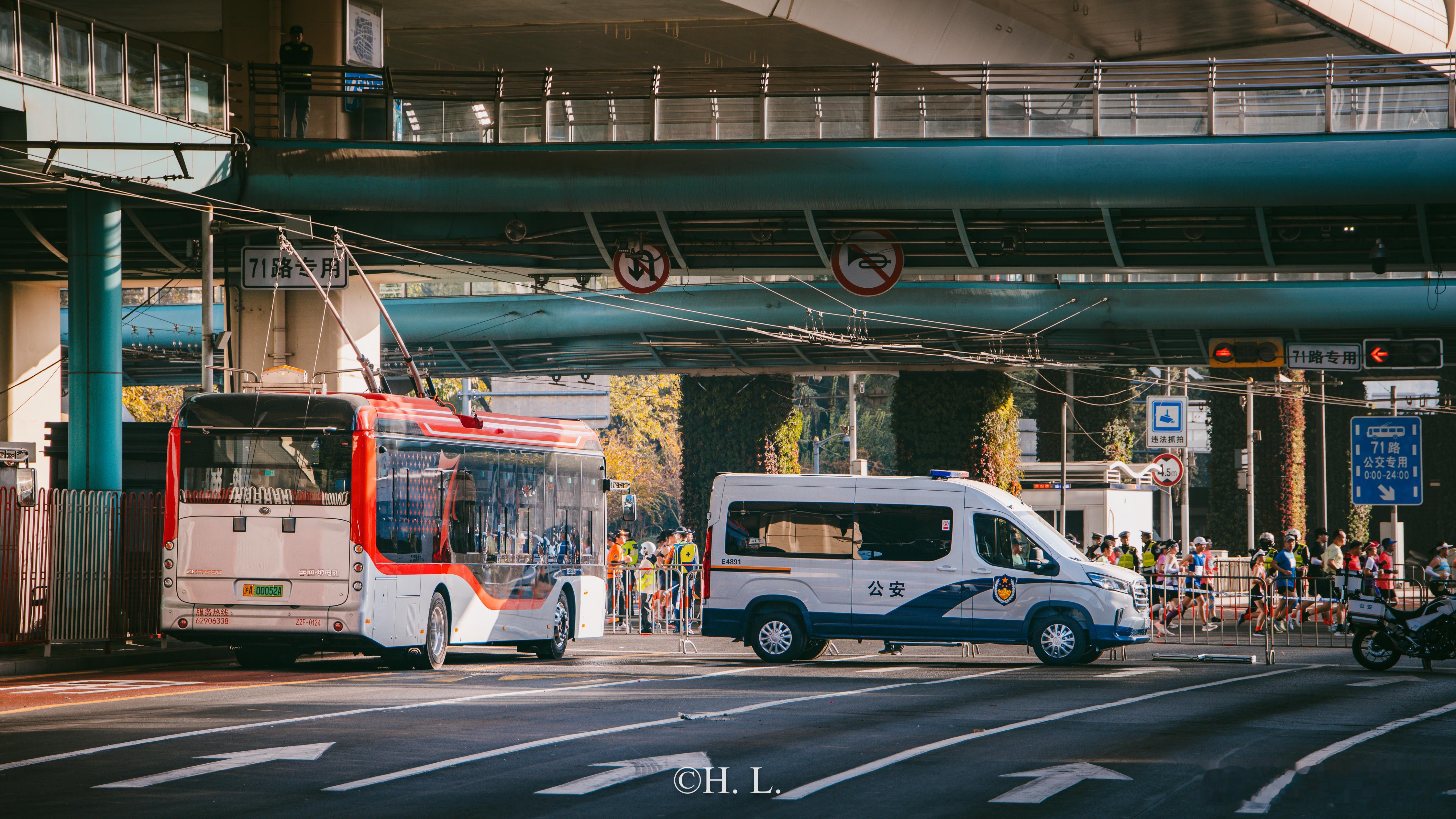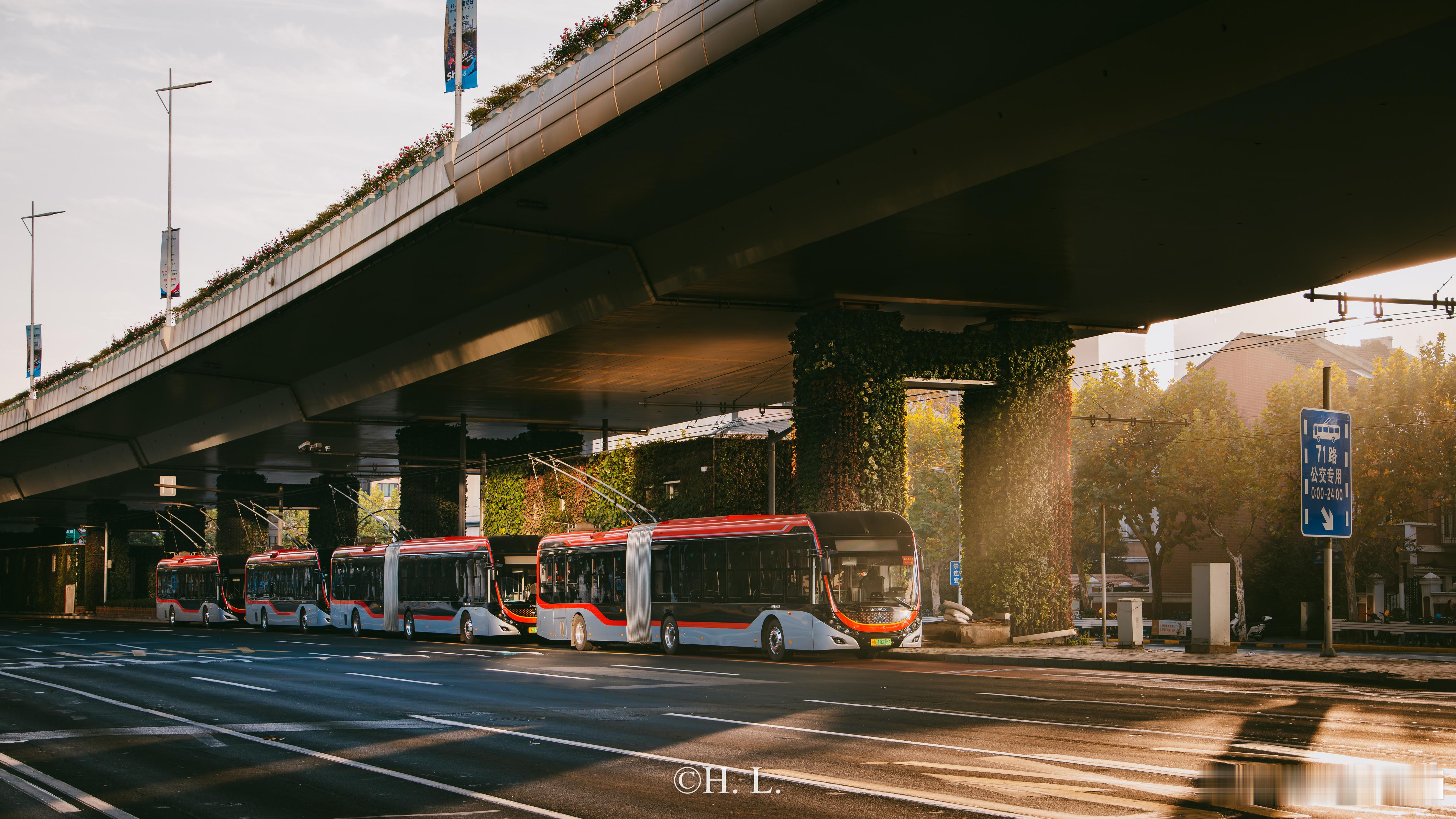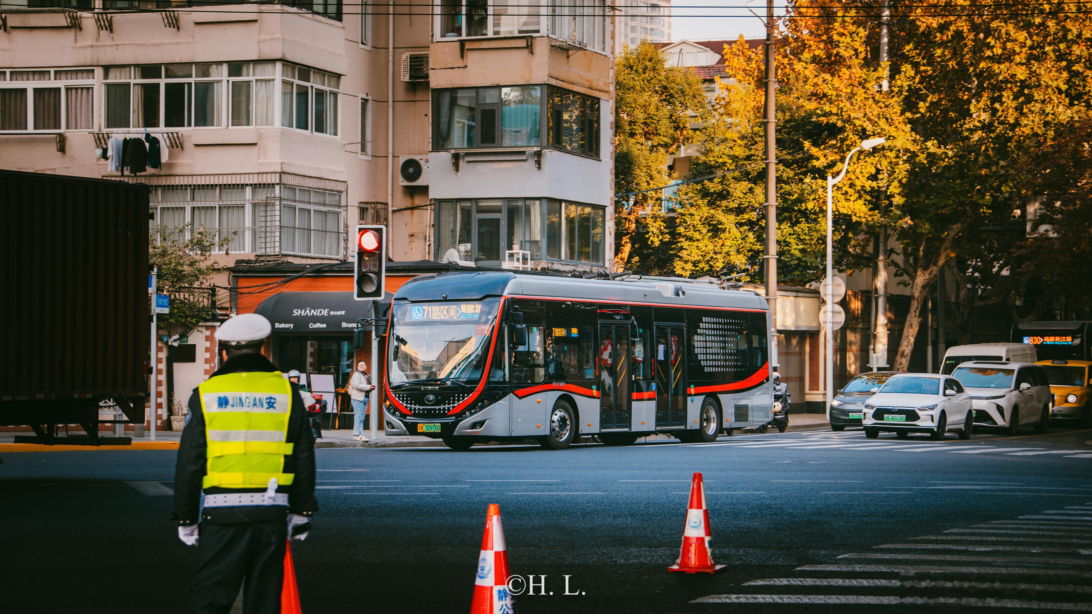 11月30日2025上海马拉松期间的电车(II)来到每年必被碰停的71路无轨电车,今年马拉松最大的不同就是71路和区间线路换新车了。另外,东向西碰停位置从去年的延安中路常德路口东移到常德路车站的位置。因为交管人员以为后面还有更多中运量电车,因此他们指挥71路缓慢移动到华山路口增加蓄车空间(图2 图3)。当然他们想错了,因为这个方向连上71路区间也只有4辆车。不过此处光线倒是真的不错。71路区间和此前的马拉松一样实施乌鲁木齐路口调头。(图4 图5 图6)71路西向东上行方向则恢复了2年前的乌鲁木齐路口碰停,不过有两辆车倒是在路口看马拉松跑者(图7 图8)上午8:35,道路解除管制,路口的71路贴花车迫不及待地想要冲出去。(图9 图10)由于今年交通管制时间较长,71路停靠点比较靠后,因此很难拍全解除管制以后71路鱼贯而出的场景。实际上一共有12辆巴士首尾相接地跑出来,只可惜阻挡的车流实在是太多了。(图11)