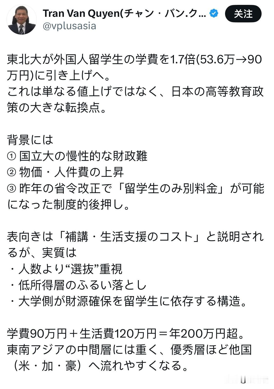 日本东北大学将国际学生学费提高1.7倍,成为2015年以来首所提高国际学生学费的