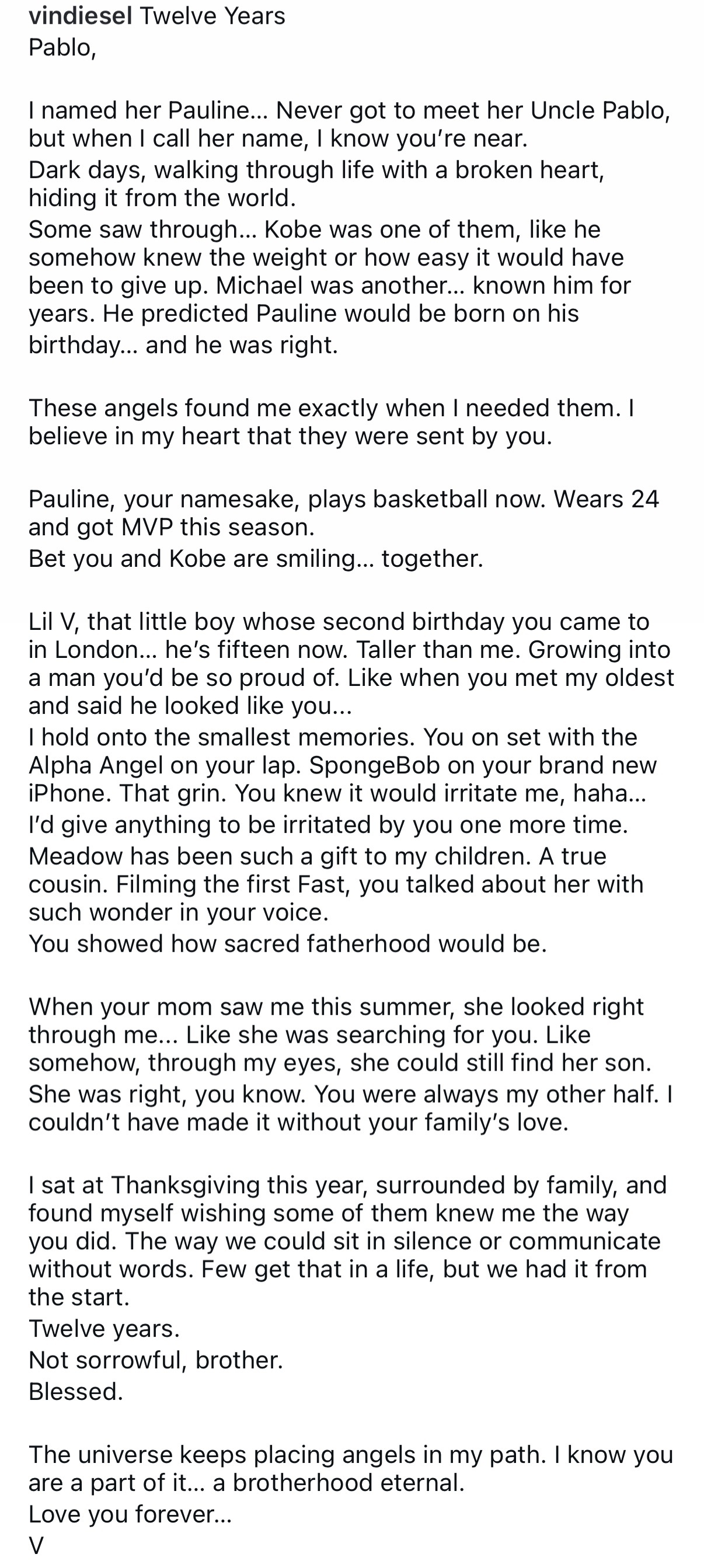 范迪塞尔缅怀保罗沃克11月30日是保罗·沃克去世12周年的日子,范·迪塞尔分享二人昔日拍摄《速度与激情5/6》合照,写下长文缅怀好兄弟保罗「致Pablo ,十二年我为她取名Pauline……她虽未曾见过她的保罗叔叔,但每当我呼唤她的名字,我便知道你在近旁。那些晦暗岁月,我怀着一颗破碎的心行走于世,将伤痛深藏。总有人能看穿……科比是其中之一,他仿佛知晓那份沉重,也明白放弃何等轻易。迈克尔是另一位……我们相识多年。他曾预言Pauline会在他生日那天降临人世……他说对了。这些天使总在我最需要的时刻出现。我心底深信,他们都是你派来的。Pauline——与你同名的孩子,如今在打篮球了。身披24号战袍,刚夺得本赛季最有价值球员。我确信你和科比一定在相视而笑……小V,那个你在伦敦为他庆祝两岁生日的小男孩……如今十五岁了。个头已超过我,长成了你定会引以为豪的模样。就像你初见我家老大时,说他眉眼似你……我紧握着那些最微小的记忆:片场里你膝头放着《阿尔法天使》剧本,新买的iPhone上播放着《海绵宝宝》,还有你那狡黠的笑。你明知会惹我恼火,哈哈……我愿付出一切,只为再被你气一次。梅朵对我孩子们而言是上天的馈赠,是真正的家人。拍第一部《速激》时,你谈起她时语气里满是惊叹。你让我明白了父爱何其神圣。今夏你母亲凝视我时,那穿透灵魂的目光……仿佛在透过我的双眼,寻觅她儿子的踪迹。她说得对,你知道的。你始终是我生命的拼图。若没有你家人的关爱,我无法走到今天。今年感恩节宴席间,虽被亲人环绕,却不禁期盼有人能如你般懂我——那种相顾无言却心意相通的默契。世人穷尽一生难求此境,而我们自始便拥有。十二年光阴。没有悲痛,兄弟。唯有感恩。宇宙不断将天使送往我途。我知道其中定有你的安排……这份兄弟情谊永世长存。永远爱你...V」