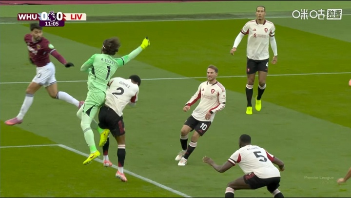 直播吧11月30日讯英超第13轮,西汉姆联vs利物浦,比赛第12分钟,阿利松出击与戈麦斯相撞,倒地后队医进场治疗,随后比赛继续。