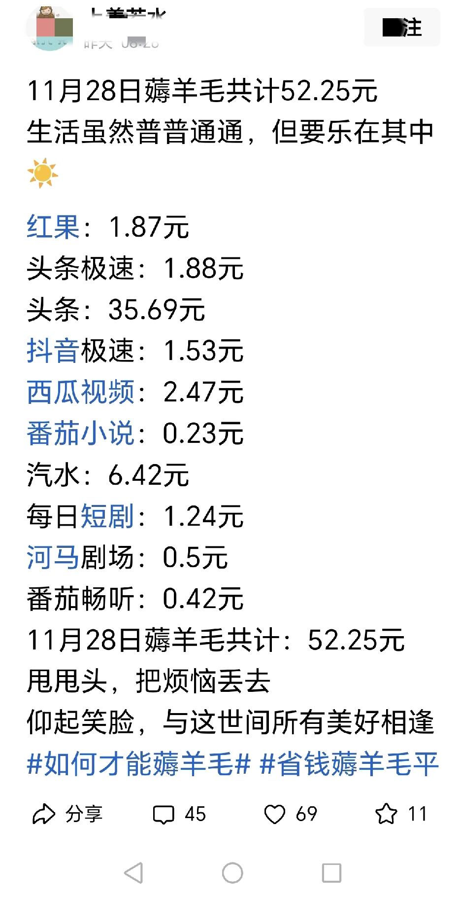 一天薅羊毛能搞到52.25元,这也太牛了。 今天刷头条的时候,看到有个老铁刷金币,一天就薅了52.25元,把小伙伴们都惊到了。 他自己说,手机里装了抖音、今日头条、红果短剧等十多个刷金币的软件。 不得不说,每个人都有自己的门道,刷金币能赚这么多钱,真挺不容易的。 我有空的时候也喜欢刷金币,不过一般一天就几毛钱,在这位大神眼里估计啥都不是。 这刷金币薅羊毛比好多成天苦思冥想搞创作的人赚得都多。 向大神致敬。 在我看来,只要不偷不抢,靠自己本事赚钱,每个人的付出都值得尊重。 你喜欢刷金币薅羊毛不?