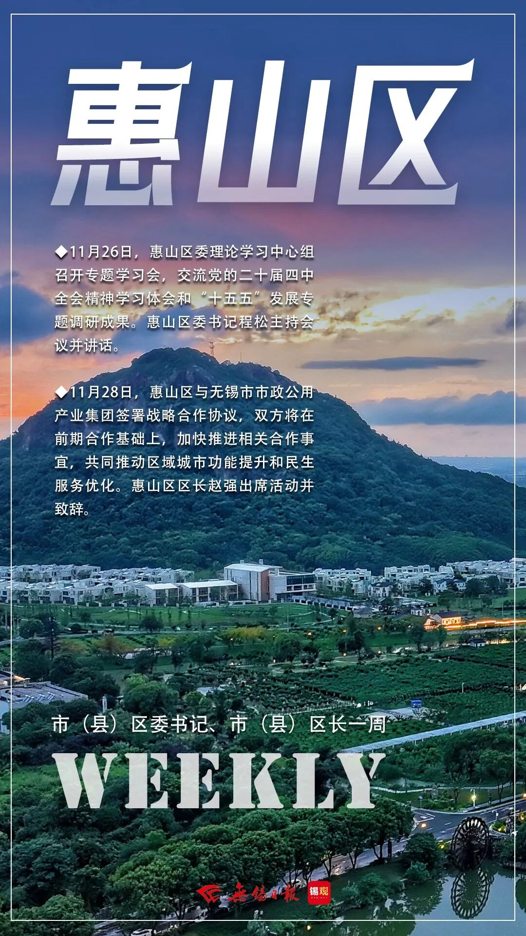 11月28日,惠山区与无锡市市政公用产业集团签署战略合作协议,双方将在前期合作基础上,加快推进相关合作事宜,共同推动区域城市功能提升和民生服务优化。惠山区区长赵强出席活动并致辞。赵强说,惠山正深入实施“空间重塑、产业重构、财力重整、城市重建、活力重振”的高质量发展改革“五重奏”,基础设施建设、公共服务供给、绿色低碳发展等领域投入力度不断加大。市政集团作为无锡城市建设“主力军”,主营业务方向与惠山发展需求不谋而合、高度契合,期待双方在水务、能源、产业园区建设、城市综合服务等领域不断深化合作,为惠山产城融合、高品质城市建设注入更加强劲动能。惠山区将全方位做好政策支持和服务保障,推动双方合作向更高水平、更深层次、更广领域发展。