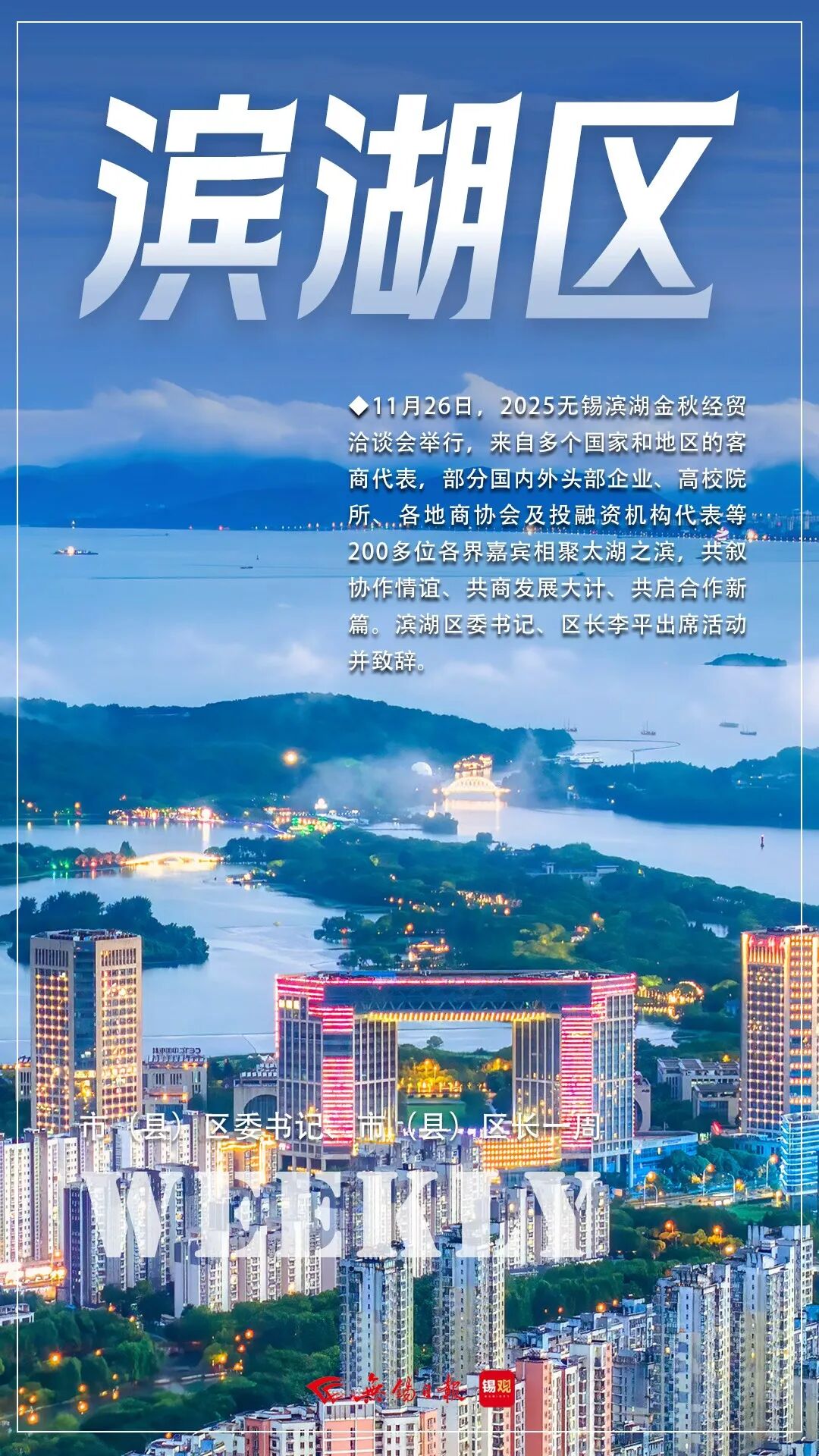 11月26日,2025无锡滨湖金秋经贸洽谈会举行,来自多个国家和地区的客商代表,部分国内外头部企业、高校院所、各地商协会及投融资机构代表等200多位各界嘉宾相聚太湖之滨,共叙协作情谊、共商发展大计、共启合作新篇。