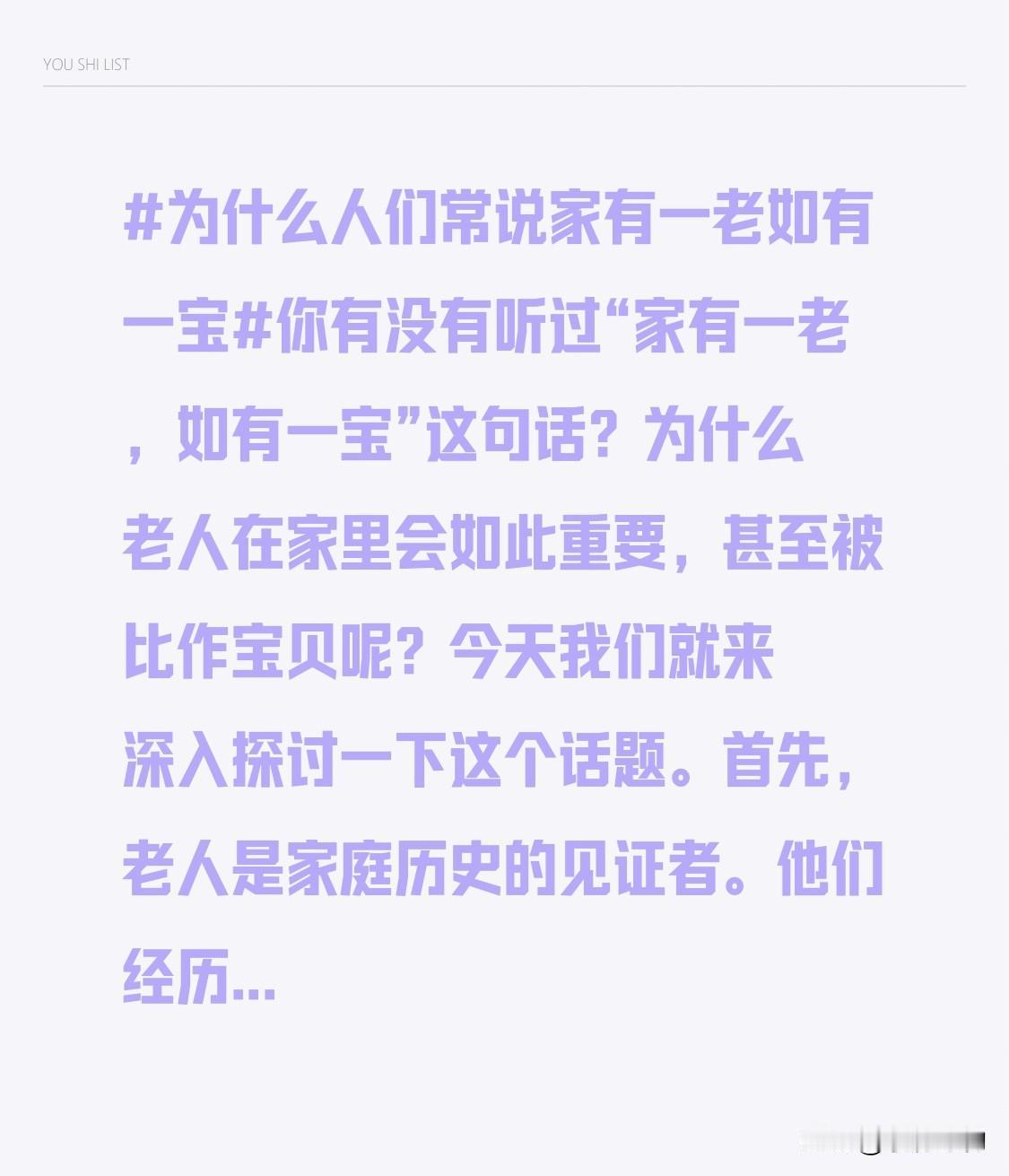 首先,老人是家庭历史的见证者。他们经历过风风雨雨,见证了家族的兴衰变迁,他们的故事和经验是家族宝贵的财富。每当家庭聚会时,听他们讲述过去的故事,总能让我们更加珍惜现在的生活。其次,老人是家庭情感的纽带。他们关心每一个家庭成员,用他们的爱和智慧维系着家庭的和谐。在遇到困难时,他们总能给出温暖的鼓励和实用的建议,让我们感受到家的温暖。再者,老人还是家庭文化的传承者。他们传承着家族的传统习俗和价值观,让我们这些后代能够了解和继承家族的文化底蕴。这些宝贵的财富,不仅让我们更加了解自己的家族,也让我们更加热爱自己的文化。 家有一老,确实如有一宝。他们不仅是我们的亲人,更是我们生活中的智者、情感的寄托和文化的传承者。如果你家也有这样的“宝贝”,不妨在评论区分享他们的故事,让我们一起感受这份温暖和力量吧!