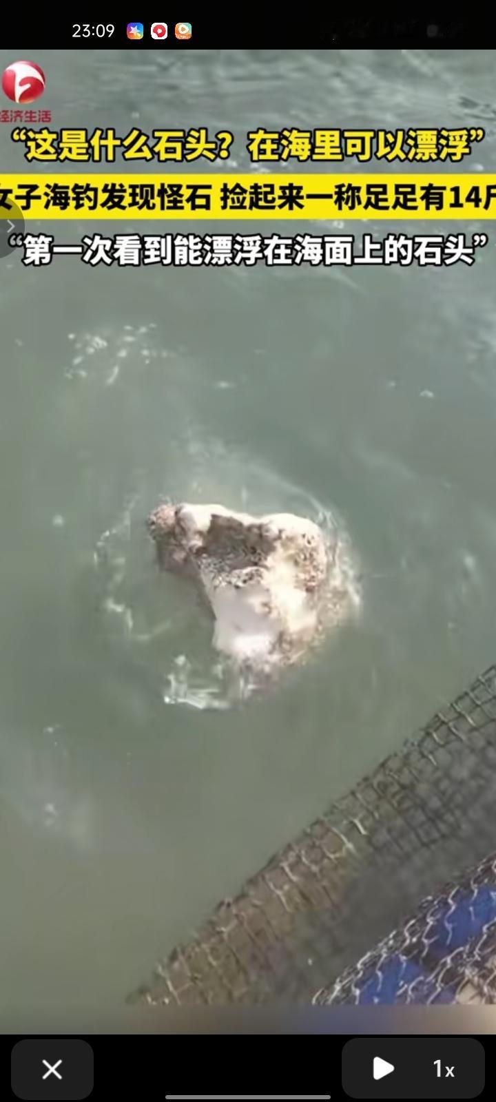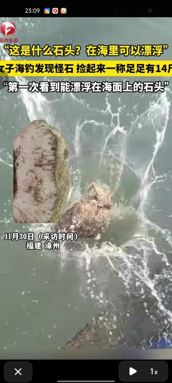 11月24日,漳州市东山县。女子晒视频表示,自己海钓时,突然发现海上飘来一块石头,还是第一次看见,觉得很新奇就把它捞起来了。这块石头很重,称了一下足足14斤多,没有去做鉴定。
