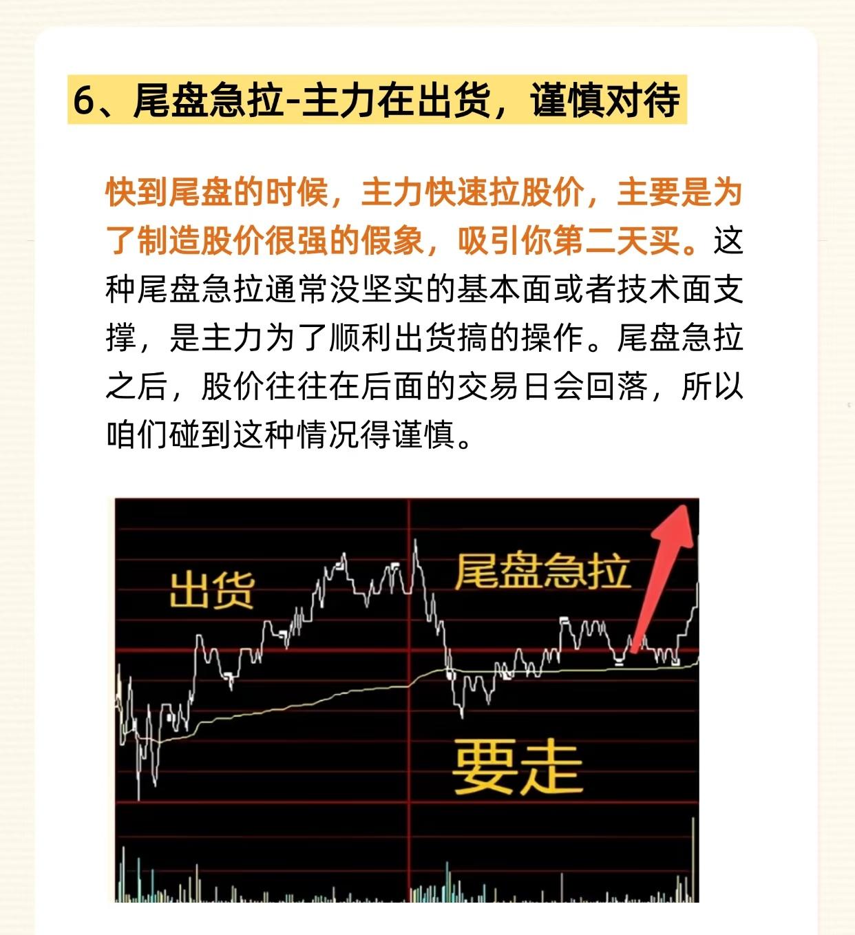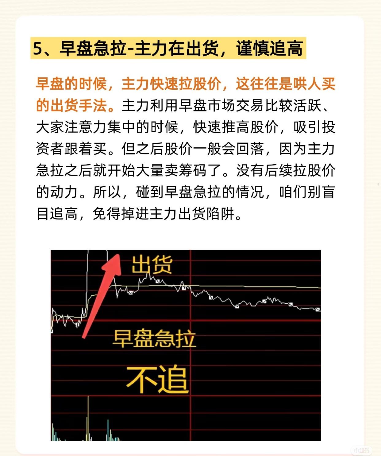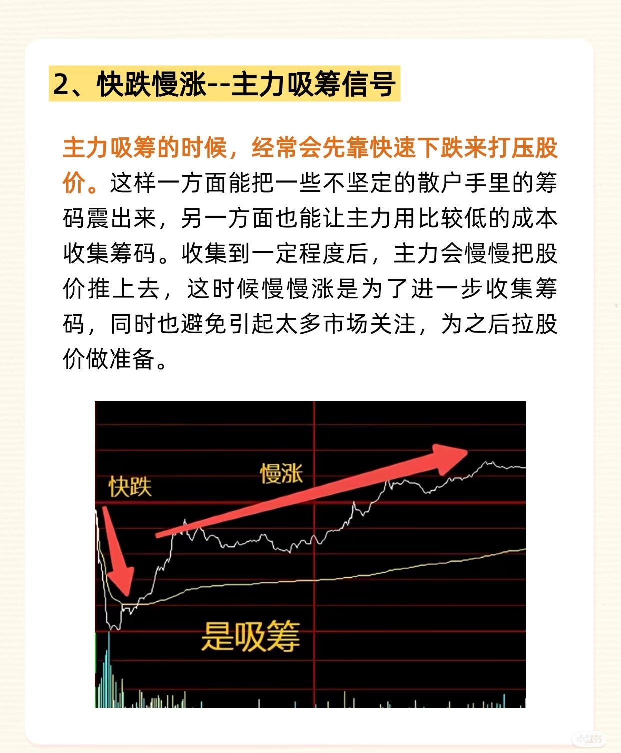 “小资金需掌握的分时图形态及主力意图”,核心是通过6种典型走势识别主力行为并给出操作提示,总结如下: 1. 快涨慢跌:主力出货信号。主力先快速拉高股价营造上涨氛围吸引买盘,待跟风资金入场后缓慢抛售筹码——因快速下跌易引发恐慌性抛售导致股价大跌,不利于高价出货,缓慢下跌可在稳定价格区间逐步落袋利润。 2. 快跌慢涨:主力吸筹信号。主力先快速下跌打压股价,既震出不坚定散户的筹码,又能低成本收集;收集到一定程度后慢慢推升股价,目的是进一步收集筹码、避免过多市场关注,为后续拉升做准备。 3. 慢涨:主力在吸筹,可持有。主力通过小幅度、持续上涨推高股价,一方面收集零散筹码,另一方面保持股价稳定、吸引投资者关注,为后续大幅拉升打基础;普通投资者可视为长期布局信号,考虑持有。 4. 慢跌:主力在出货,需离场。主力为避免快速暴跌引发恐慌、维持散户信心(让其误认正常调整),选择缓慢下跌逐步卖出筹码;此时应谨慎,及时离场避免更大损失。 5. 早盘急拉:主力出货,谨慎追高。主力利用早盘交易活跃、注意力集中时快速拉高股价吸引跟风,随后大量抛售筹码致股价回落(无后续拉升动力);切勿盲目追高,防止落入出货陷阱。 6. 尾盘急拉:主力出货,谨慎对待。临近尾盘快速拉股价是为制造强势假象,吸引次日买入,此类操作无基本面或技术面支撑,后续股价常回落;需警惕并谨慎应对。 整体而言,6种形态分别指向主力“出货”或“吸筹”的核心意图,小资金可通过识别这些走势判断主力动作,辅助决策持有、离场或规避追高风险。