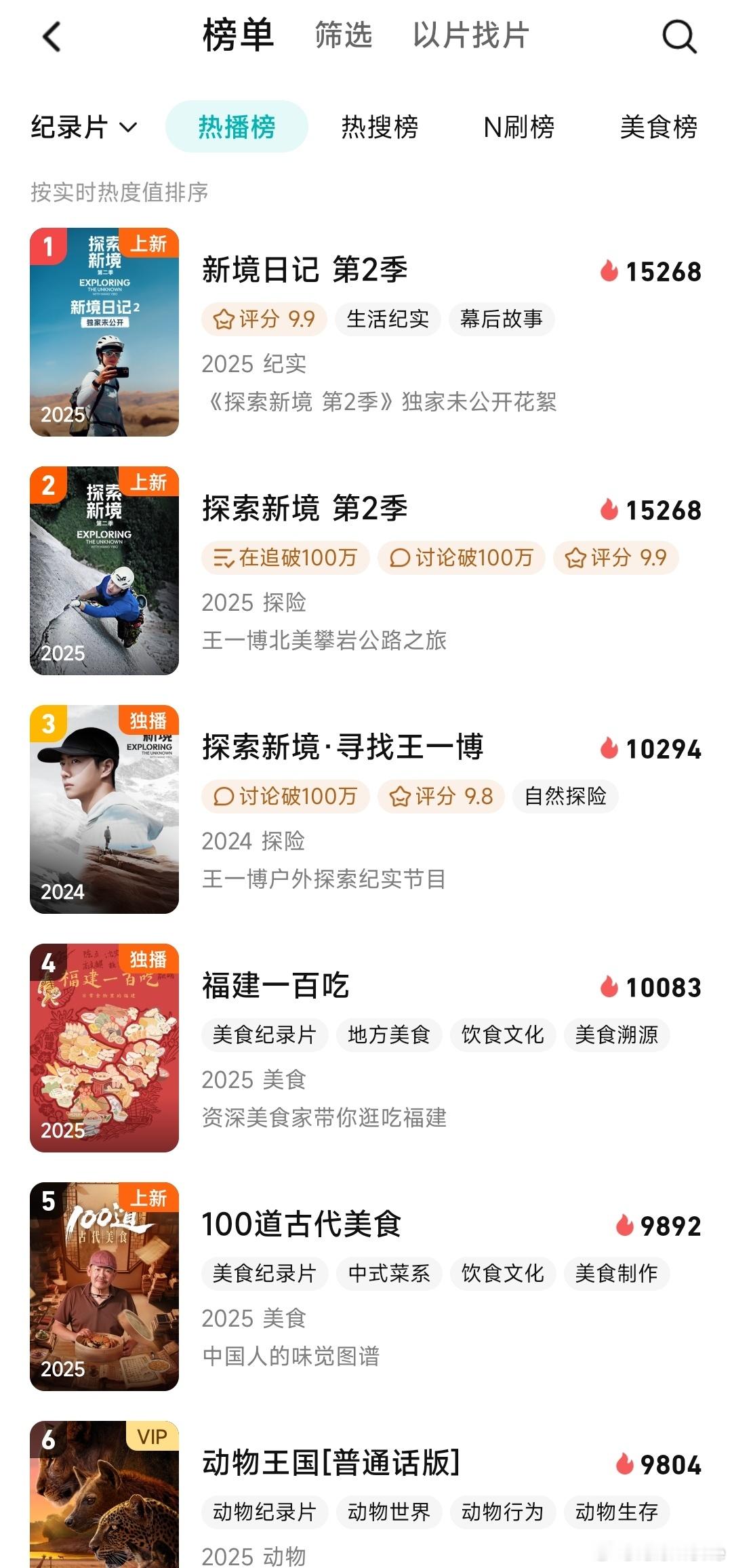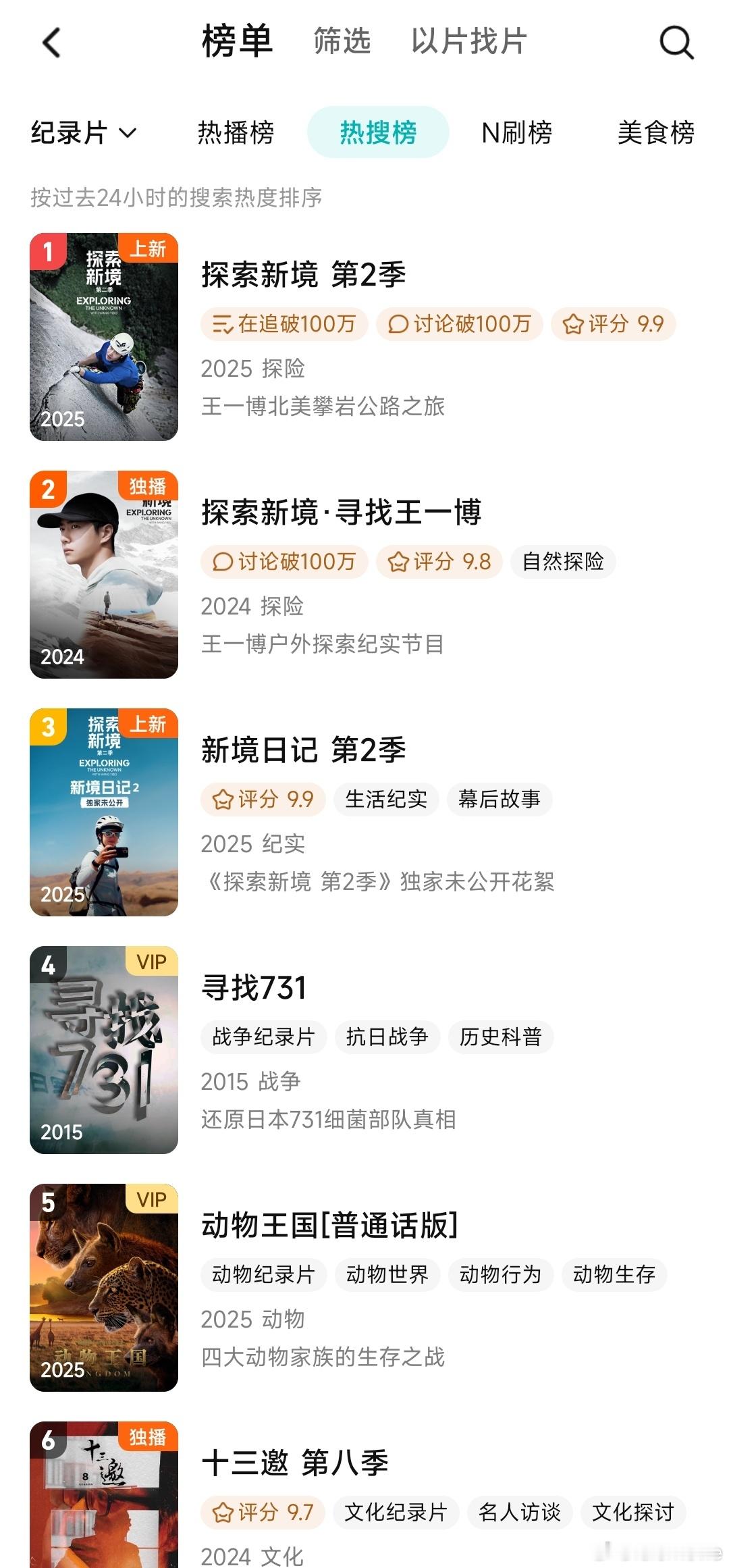 热搜榜、热播榜前三位都是王一博的《探索新境》相关,《探索新境2》的讨论也破了百万,4.8万人打分依然是坚挺的9.9分,生命向上的极致精神力。王一博分享上厕所视角探索新境2佳片奇遇季