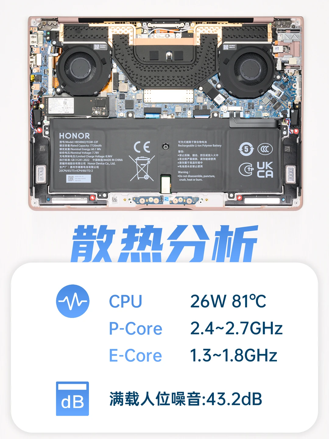 可能是为了轻量化,这台电脑60Wh的电池容量比较小,但幸好有ARL处理器补救,今年Intel的能耗比增强许多,使得它的续航表现没有脱离大部队。[暗中观察R]