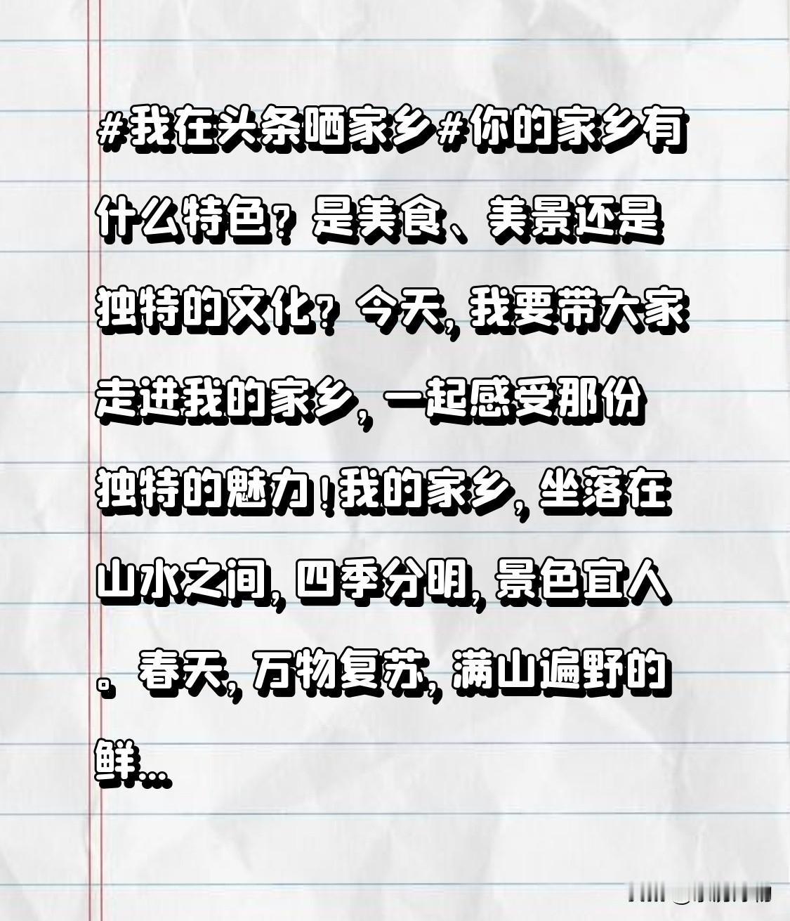 你的家乡有什么特色?是美食、美景还是独特的文化?今天,我要带大家走进我的家乡,一起感受那份独特的魅力! 我的家乡,坐落在山水之间,四季分明,景色宜人。春天,万物复苏,满山遍野的鲜花盛开,仿佛置身于花的海洋;夏天,绿树成荫,清凉宜人,是避暑的好去处;秋天,金黄的稻田与火红的枫叶交相辉映,构成了一幅美丽的画卷;冬天,白雪皑皑,银装素裹,仿佛进入了童话世界。除了四季变换的美景,我的家乡还有着丰富的美食文化。从街头巷尾的小吃摊,到高档餐厅的精致佳肴,每一道菜都承载着家乡的味道和记忆。特别是那道独具特色的家乡菜,更是让人回味无穷,每次品尝都能感受到家乡的温暖和亲切。此外,我的家乡还有着独特的民俗文化,各种传统节日和庆典活动丰富多彩,让人流连忘返。 家乡,是我们永远的根和牵挂。无论走到哪里,那份对家乡的热爱和思念都永远不会改变。欢迎大家在评论区分享你的家乡故事,让我们一起感受那份来自家乡的温暖和力量!