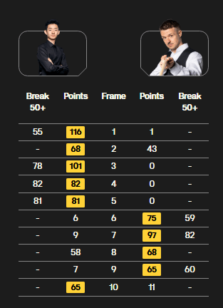 比赛中,吴宜泽开局5-0领先,之后连丢4局。关键第10局,吴宜泽多次上手惊险拿下。