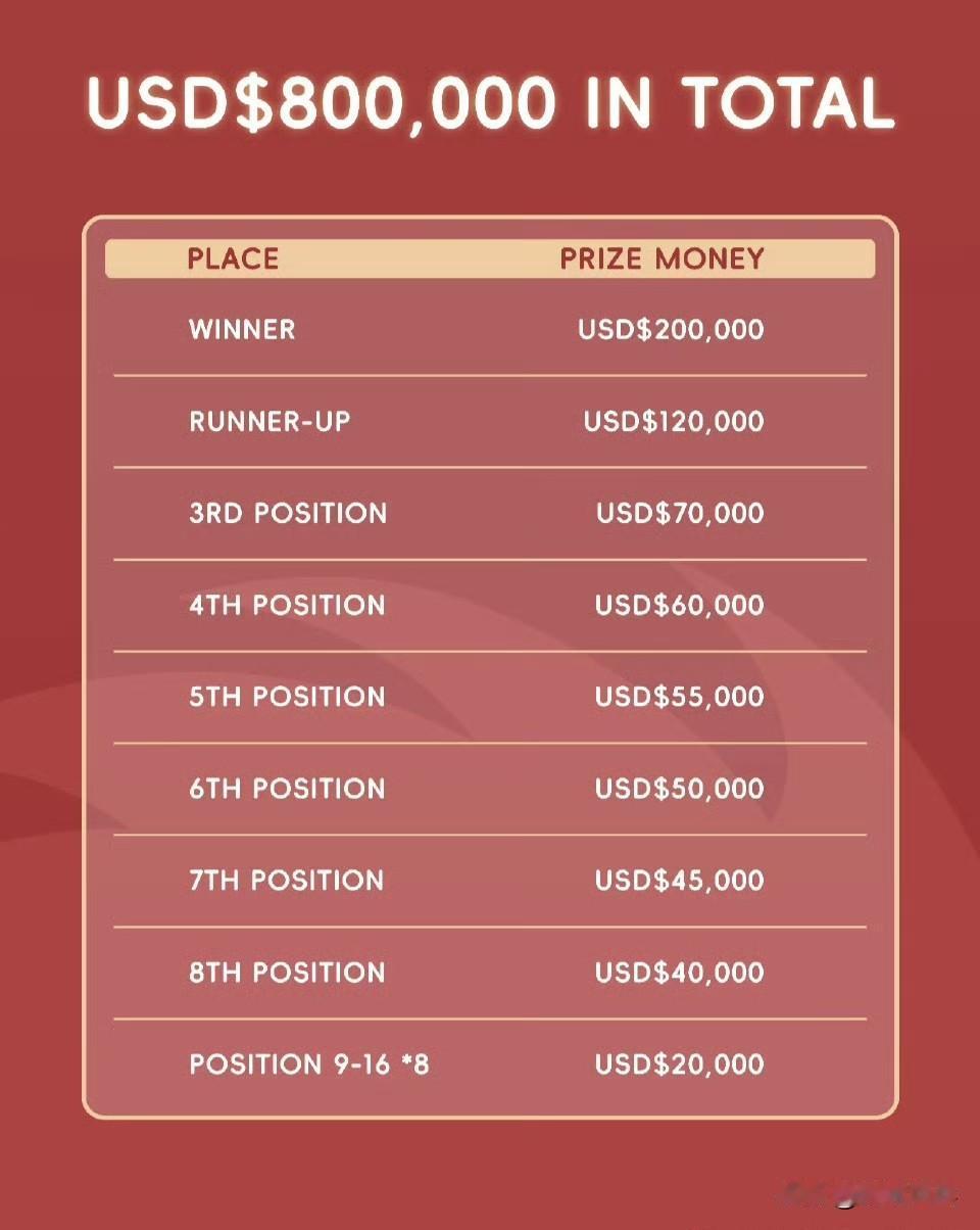 总奖金80万美元 冠军🏆:20万美元 亚军🥈:12万美元 季军🥉:7万美元 第四名:6万美元 第五名:5.5万美元 第六名:5万美元 第七名:4.5万美元 第八名:4万美元 第9-16名(共8名):2万美元 2025.12.1