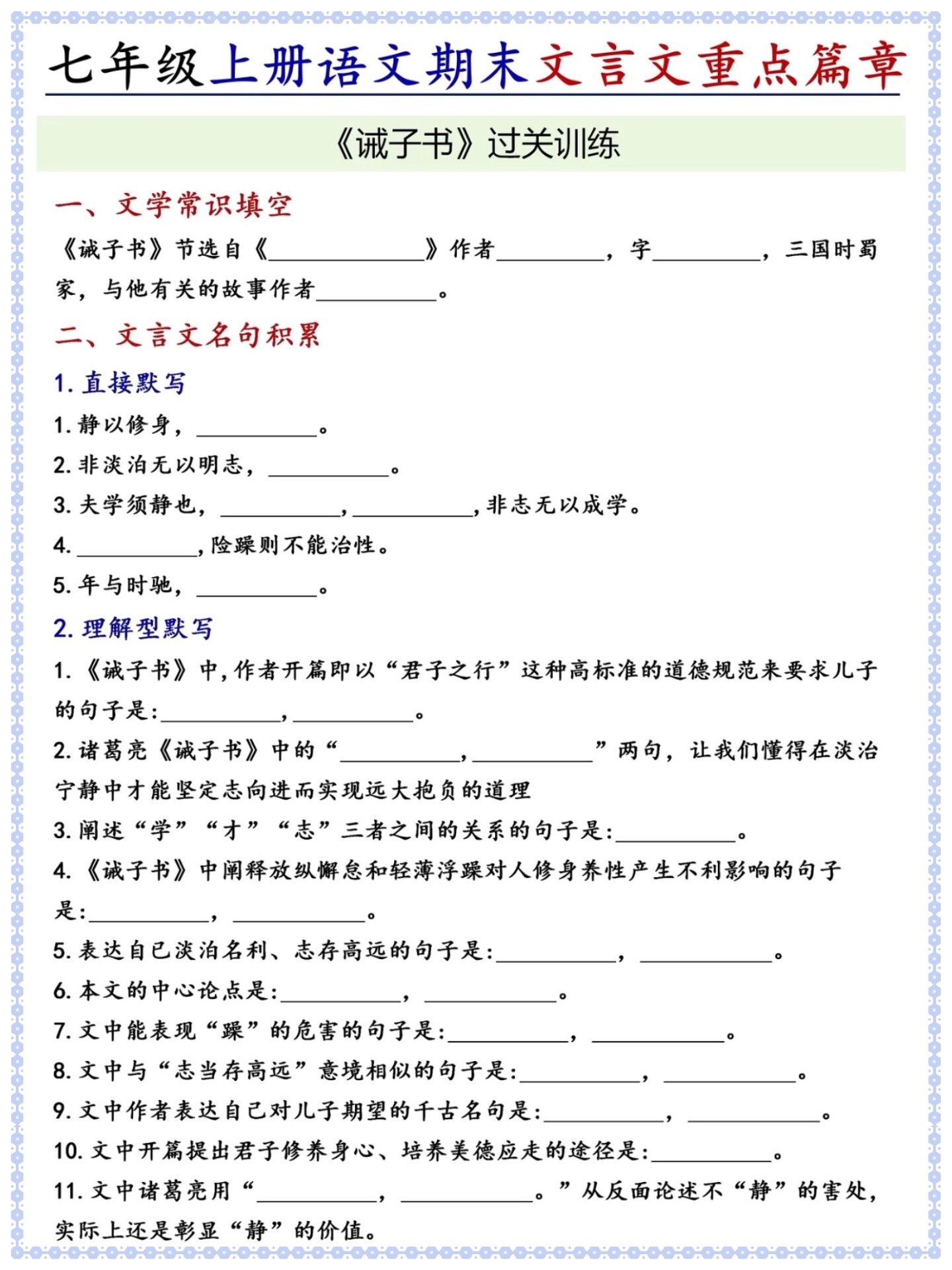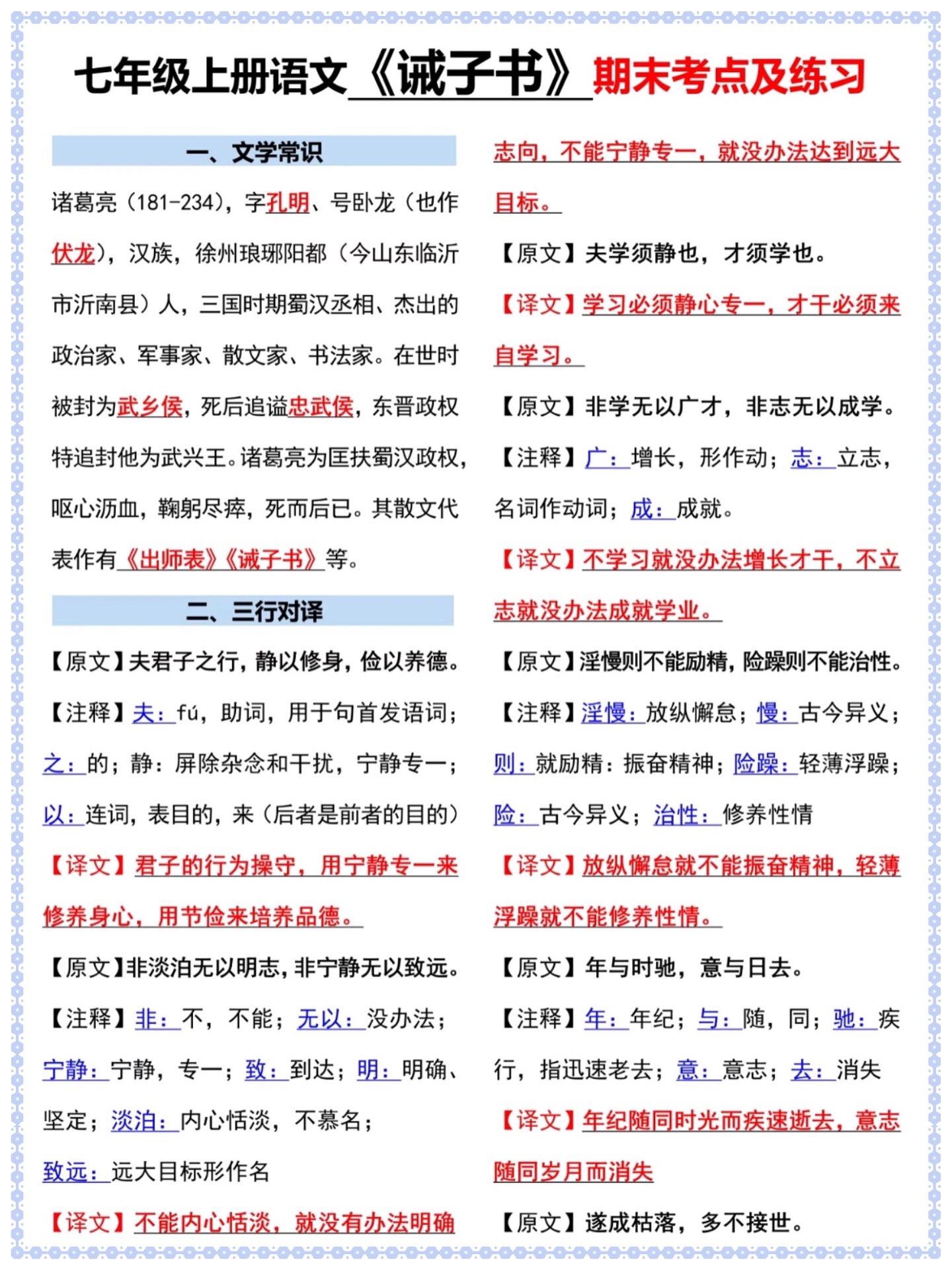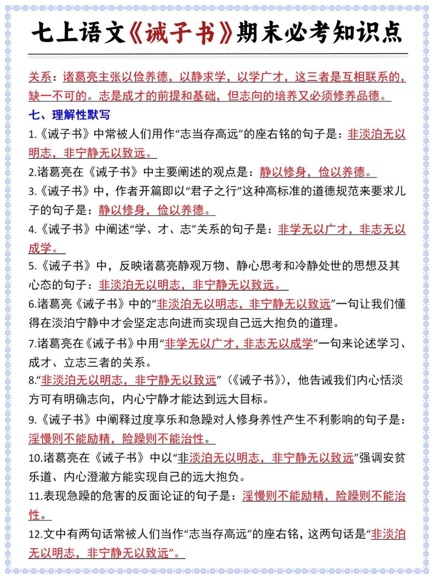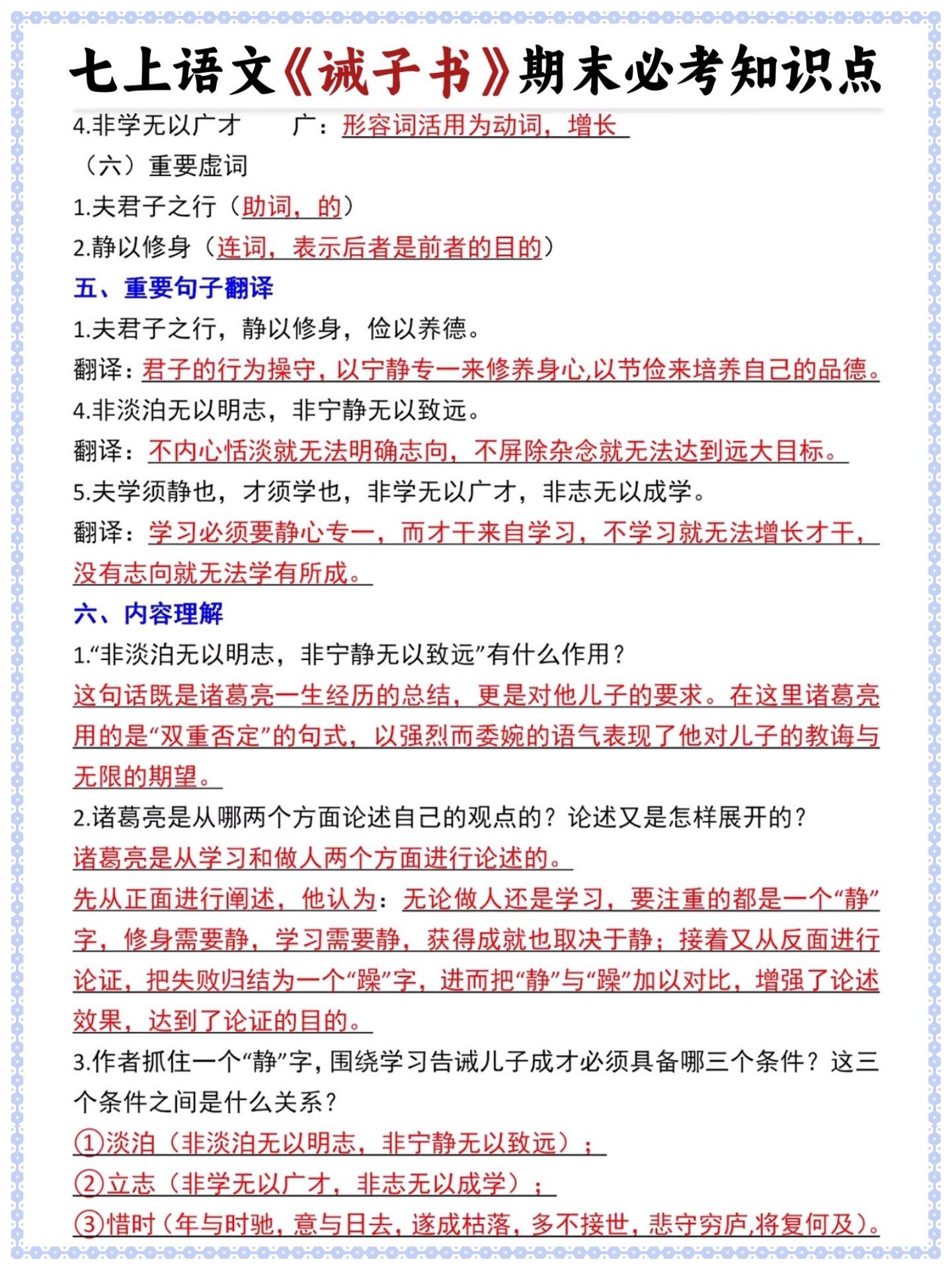 七年级上册语文期末重难点诫子书必考知识点。七年级上册诫子书老师给大家整...