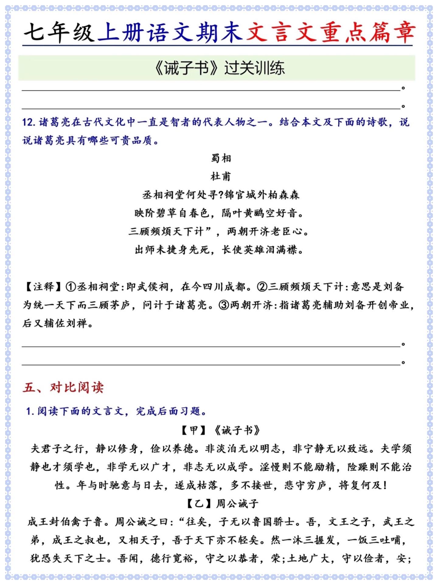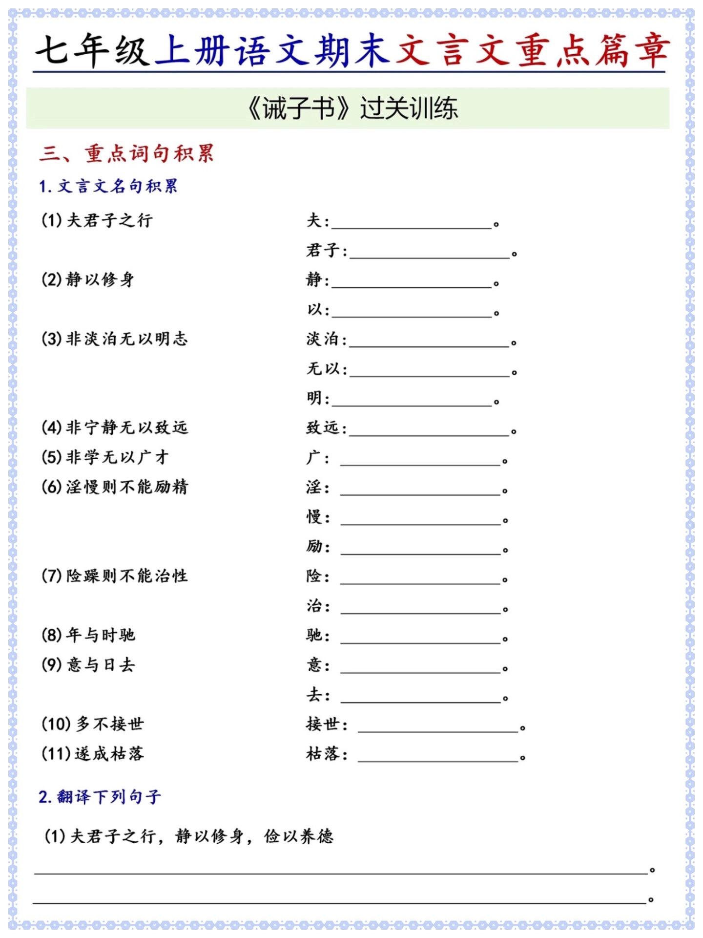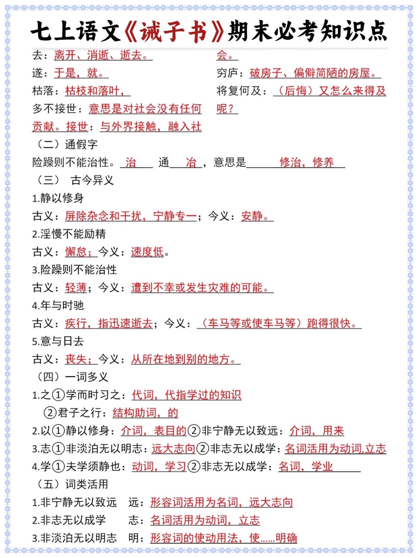 七年级上册语文期末重难点诫子书必考知识点。七年级上册诫子书老师给大家整...