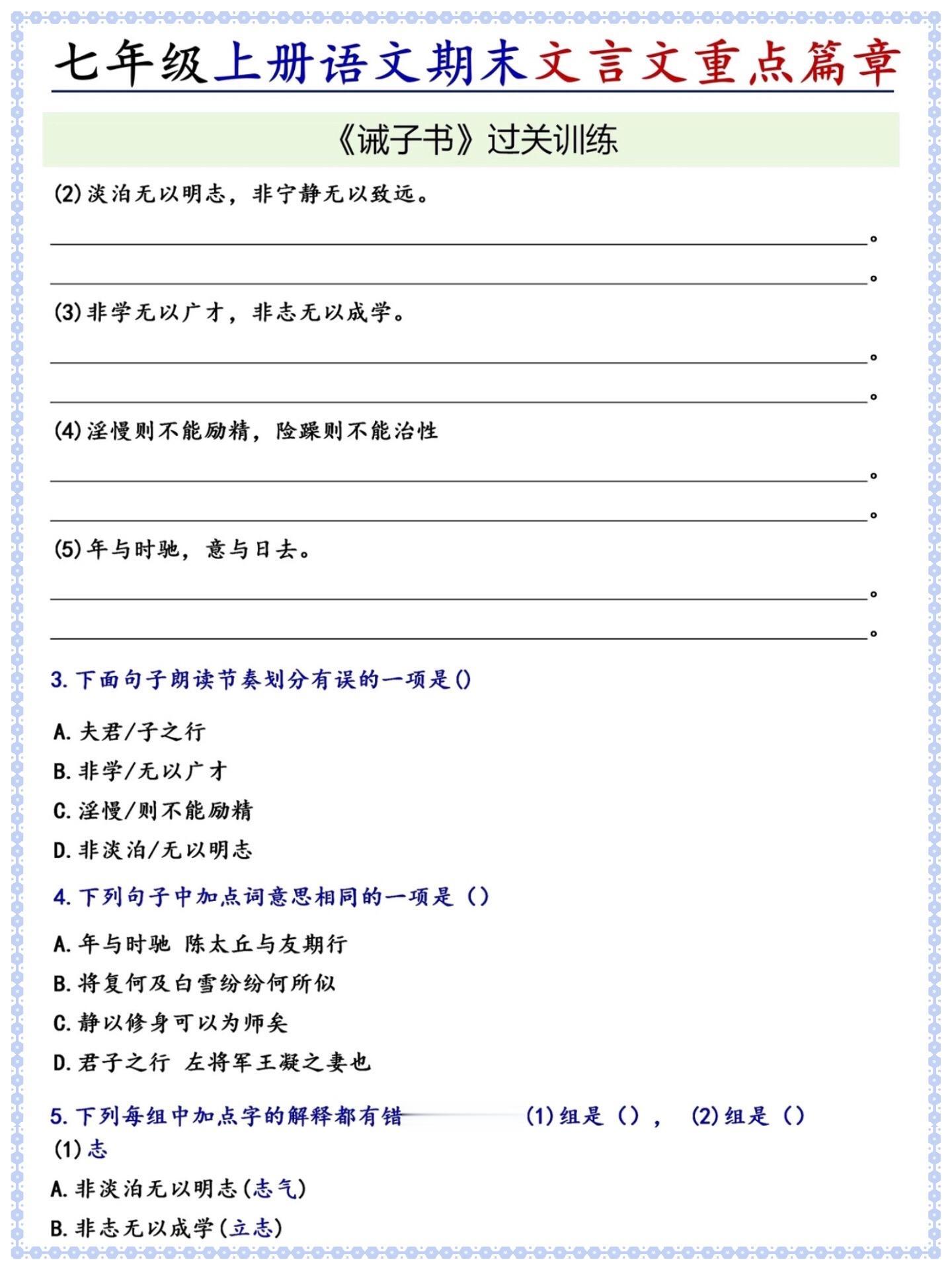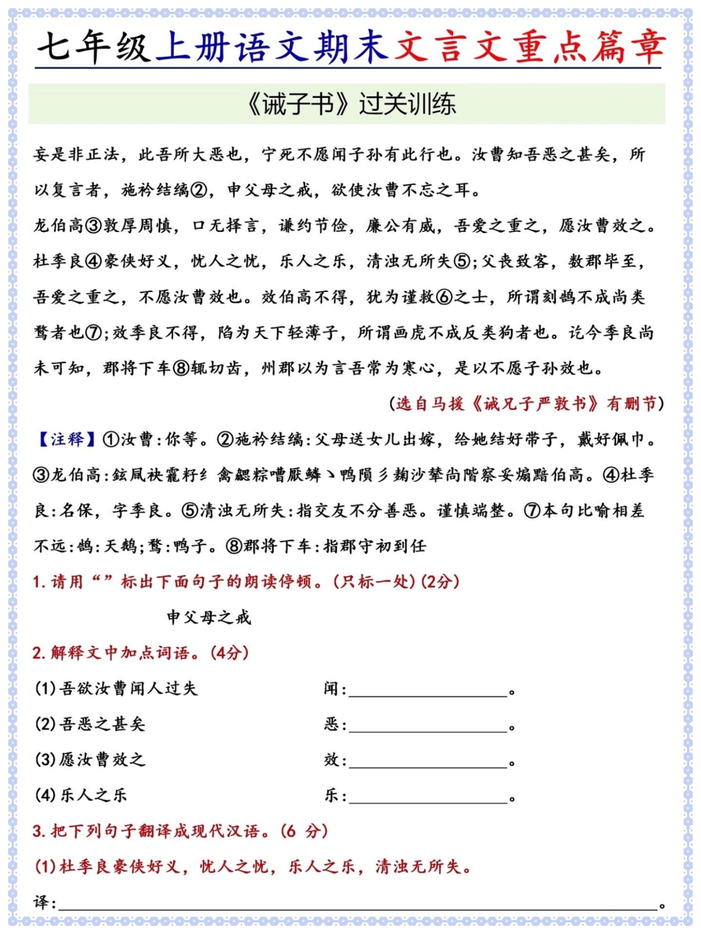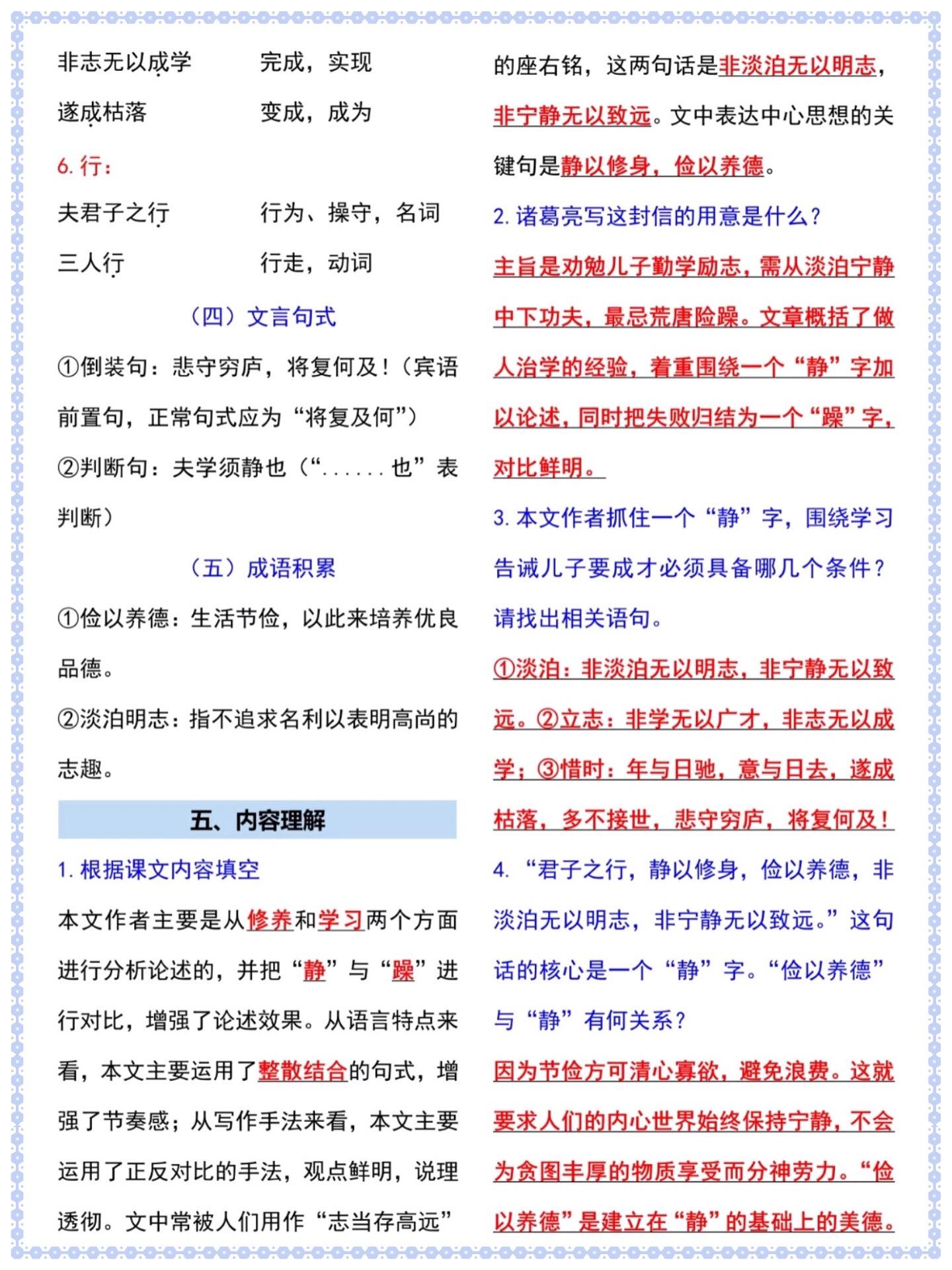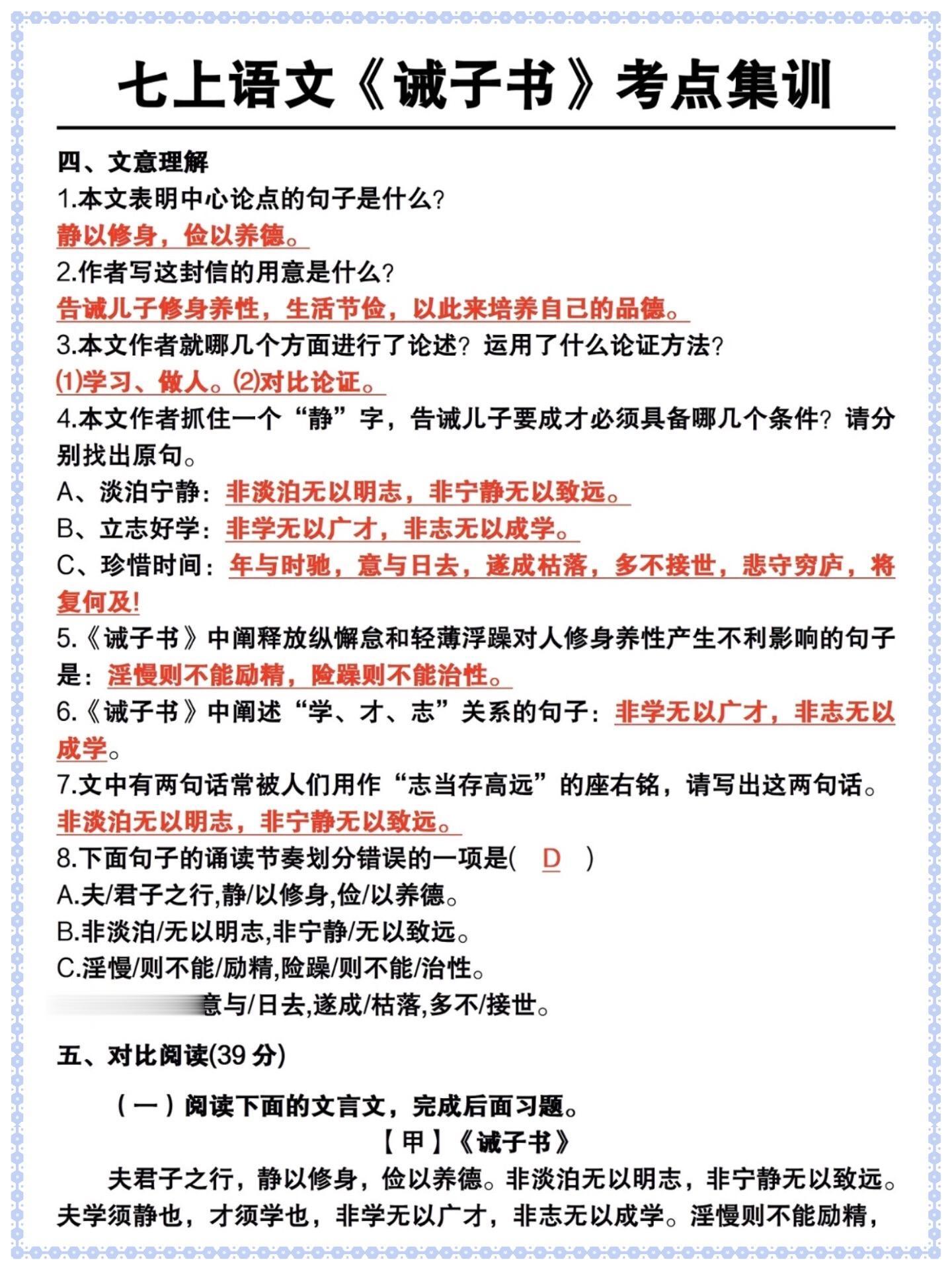 七年级上册语文期末重难点诫子书必考知识点。七年级上册诫子书老师给大家整...