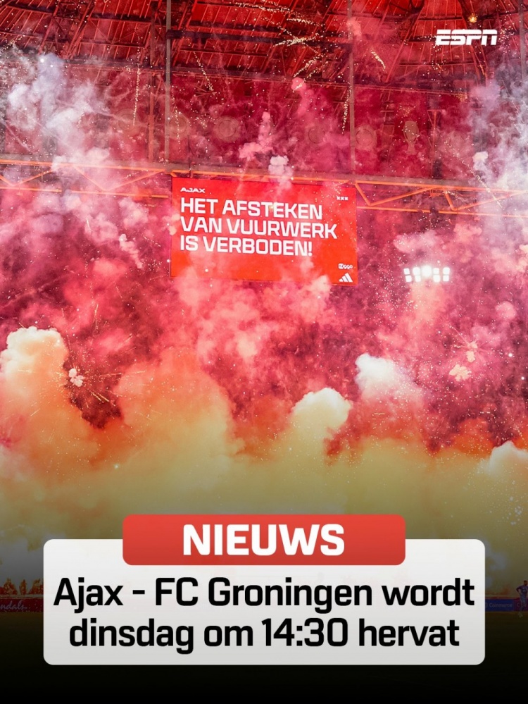 "阿贾克斯与格罗宁根的比赛将于周二14:30(北京时间当天21:30)恢复进行。该场比赛在周日晚间因反复燃放烟花而被取消,当时比分为0-0。比赛中断时,阿贾克斯与格罗宁根的比赛已进行了近六分钟。此场补赛将空场进行。"