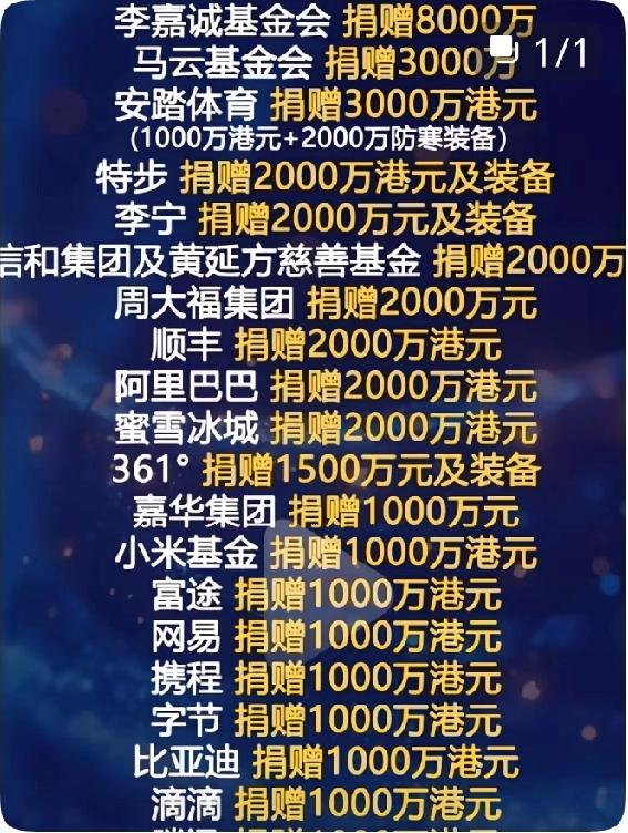 香港大埔宏福苑火灾真让人揪心, 社会各界都纷纷搭手相助! 捐款名单里有几个人特别亮眼! 现在大家都赶紧搭把手帮忙呢。让人没想到的是,这次捐款的几个人特别亮眼:钱峰雷自己掏腰包捐了1200万港元,台湾的网红馆长陈之汉也跟着捐了100万,李嘉诚基金会更是一下子就捐了8000万,真是太给力了。 钱峰雷这些年平时挺少露面的,这次却主动站出来,以个人名义拿出钱来帮忙。他是马云的朋友,以前汶川、玉树地震的时候,他自己捐款的数额都很惊人,现在又一次让人看到他的爱心了。台湾的网红馆长虽然事业上遇到点波折,但还是坚持捐了百万善款,用行动证明了同胞之间真的很团结。 在大家常说四大家族里,李嘉诚这次捐的钱比其他几家加起来都多。之前虽然有些不同的声音,但他一直没忘做公益的本心,这8000万都会用来帮大家重建家园呢。这场灾难让所有人都看到了同胞们的团结,“一方有难八方支援”的精神又亮起来了。这样的温暖,是不是特别让人感动?你身边有没有这样互相帮忙的故事呢?