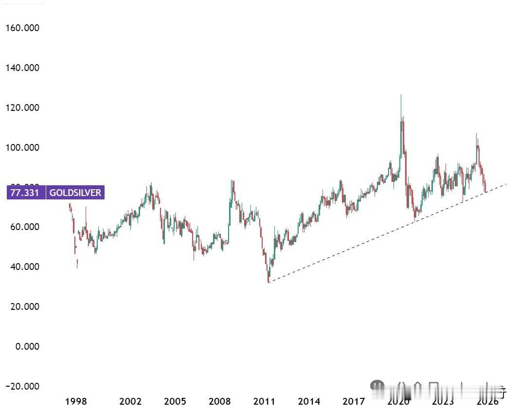干货:关于如何配置黄金和白银的。只是历史经验,选择的时候需要结合自己的体验来做。把金价除以银价,就有个比值,一图:目前的位置在77左右,本图画了一个趋势线(虚线处)。可以看到近期几轮行情的临界点,会做技术风险的应该秒懂。 当金银比高于80的时候,意味着白银相对黄金进入低估区间,或黄金因过度避险情绪被超买,定投的金额可全部白银; 当金银比低于50的时候,则表明白银相对黄金处于高估区间,或白银因工业需求激增被过度炒作,定投的金额大多数买入黄金; 当金银比在50-80之间的时候,黄金和白银都买。随着后续金银比可能出现突破80的分界线,再给个历史数据参考。 过去20年里,每当金银比突破80:1,白银随后12个月的平均涨幅达到35,最高涨幅甚至超过100 %。 黄金投资还有一个最朴素的做法,那就是一切跟着央行走。央行不停买,你就不停跟,央行停了你就跑。 如何查询央行买不买黄金,持仓多少?👉 搜索「国家外汇管理局」 👉 或者网页自己找「」 👉 进入「统计数据」—「外汇储备」—「官方储备资产」 👉 选择HTML格式,即可看到每个月的更新数据。