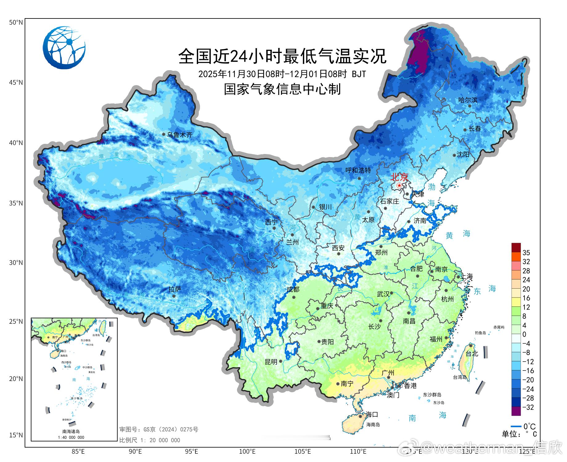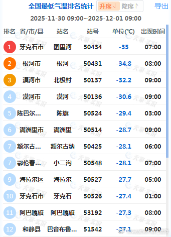 【降温】今晨在冷空气影响下,北方多地出现降温,内蒙古、黑龙江、河北、山西部分站点降温超10℃。内蒙古图里河今晨最低零下35℃,创内蒙古自治区今冬以来气温新低。未来冷空气的降温还会持续,并且向南推进。未来2天早晨,东北华北黄淮多地气温将创下半年新低。