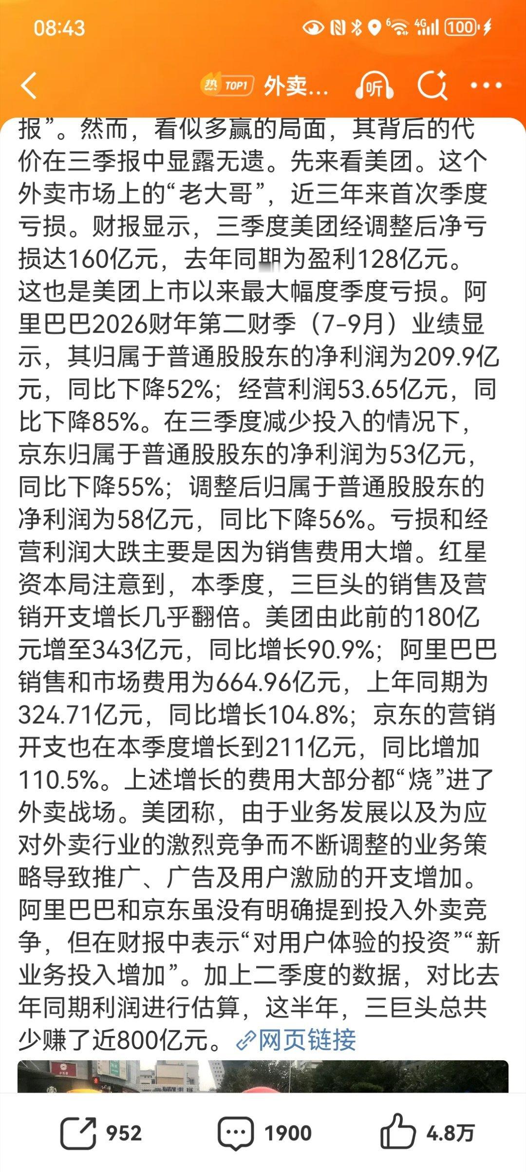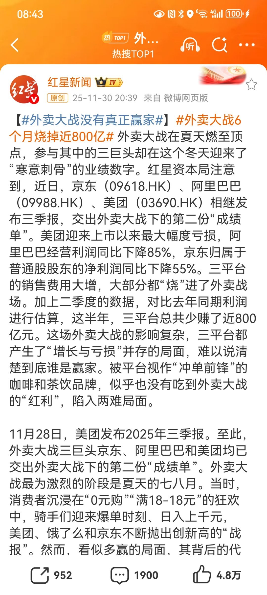 【外卖大战没有真正赢家】外卖大战6个月烧掉近800亿 京东、阿里巴巴、美团三大平台最新财报显示,由价格战引发的"外卖大战"在近两个季度已造成总计近800亿元的利润损失。美团出现上市以来最大亏损,阿里经营利润骤降85%,京东净利润下滑55%,三巨头均陷入"增长与亏损并存"的困境。全网热点共创计划这场烧钱大战本质是资本无序扩张的典型样本。以低于成本的补贴进行市场竞争,已涉嫌违反《反不正当竞争法》。平台经济不应异化为"烧钱-垄断-收割"的资本游戏,而应回归服务本质。外卖平台、网约车平台本就该是微利业态,必须通过合理定价保障骑手(网约车司机)权益与商家利润。监管部门需强化底线约束,引导平台从恶性竞争转向服务质量、技术创新与效率提升的健康发展轨道。