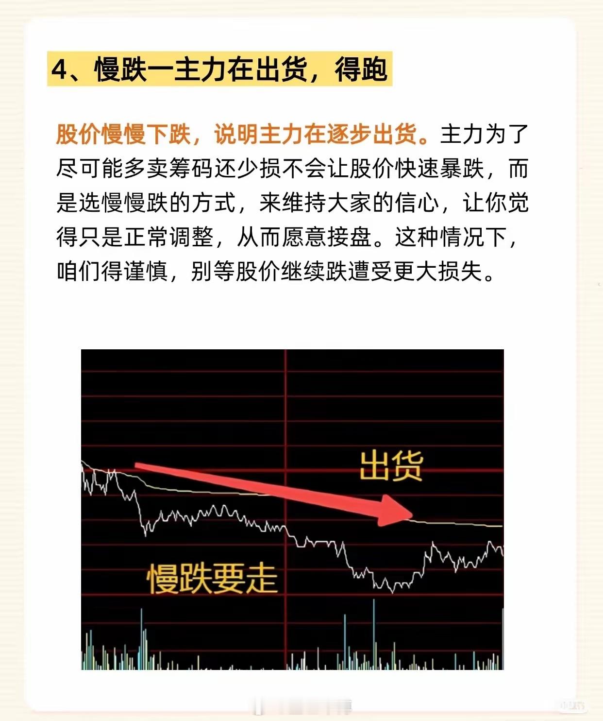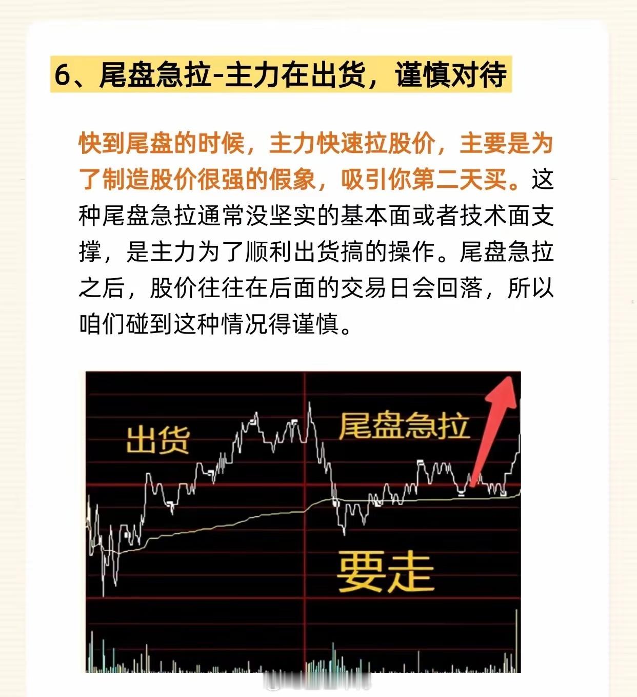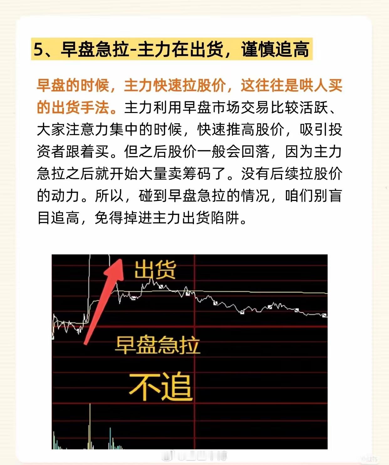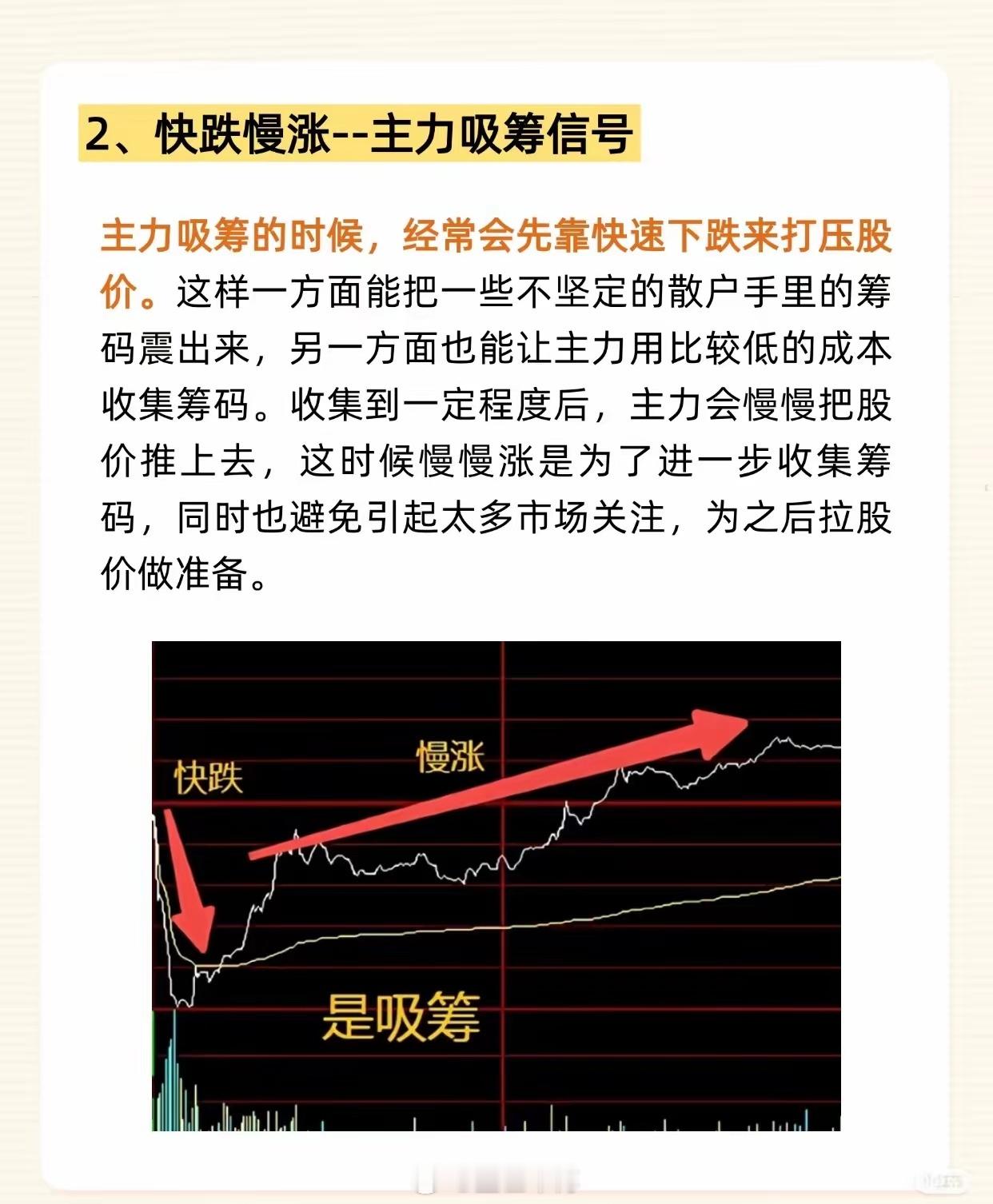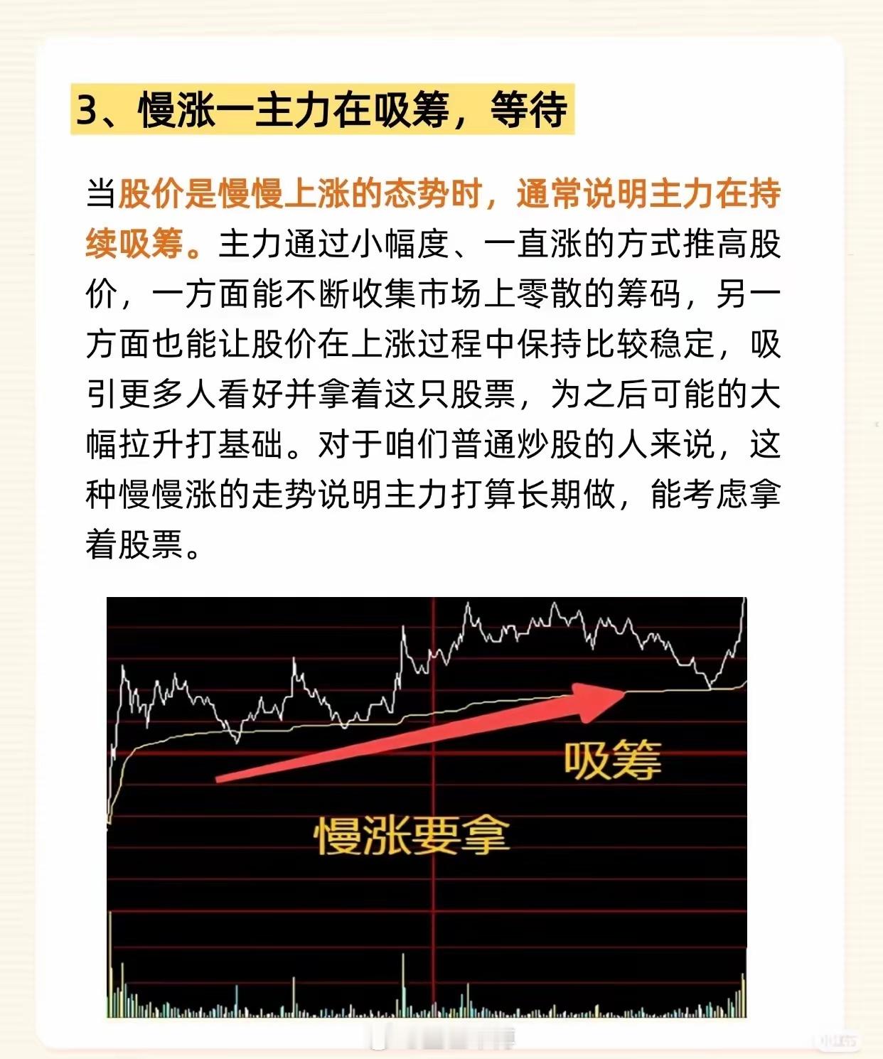 “小资金需掌握的分时图形态及主力意图”,核心是通过6种典型走势识别主力行为并给出操作提示,总结如下:1. 快涨慢跌:主力出货信号。主力先快速拉高股价营造上涨氛围吸引买盘,待跟风资金入场后缓慢抛售筹码——因快速下跌易引发恐慌性抛售导致股价大跌,不利于高价出货,缓慢下跌可在稳定价格区间逐步落袋利润。2. 快跌慢涨:主力吸筹信号。主力先快速下跌打压股价,既震出不坚定散户的筹码,又能低成本收集;收集到一定程度后慢慢推升股价,目的是进一步收集筹码、避免过多市场关注,为后续拉升做准备。3. 慢涨:主力在吸筹,可持有。主力通过小幅度、持续上涨推高股价,一方面收集零散筹码,另一方面保持股价稳定、吸引投资者关注,为后续大幅拉升打基础;普通投资者可视为长期布局信号,考虑持有。4. 慢跌:主力在出货,需离场。主力为避免快速暴跌引发恐慌、维持散户信心(让其误认正常调整),选择缓慢下跌逐步卖出筹码;此时应谨慎,及时离场避免更大损失。5. 早盘急拉:主力出货,谨慎追高。主力利用早盘交易活跃、注意力集中时快速拉高股价吸引跟风,随后大量抛售筹码致股价回落(无后续拉升动力);切勿盲目追高,防止落入出货陷阱。6. 尾盘急拉:主力出货,谨慎对待。临近尾盘快速拉股价是为制造强势假象,吸引次日买入,此类操作无基本面或技术面支撑,后续股价常回落;需警惕并谨慎应对。整体而言,6种形态分别指向主力“出货”或“吸筹”的核心意图,小资金可通过识别这些走势判断主力动作,辅助决策持有、离场或规避追高风险。