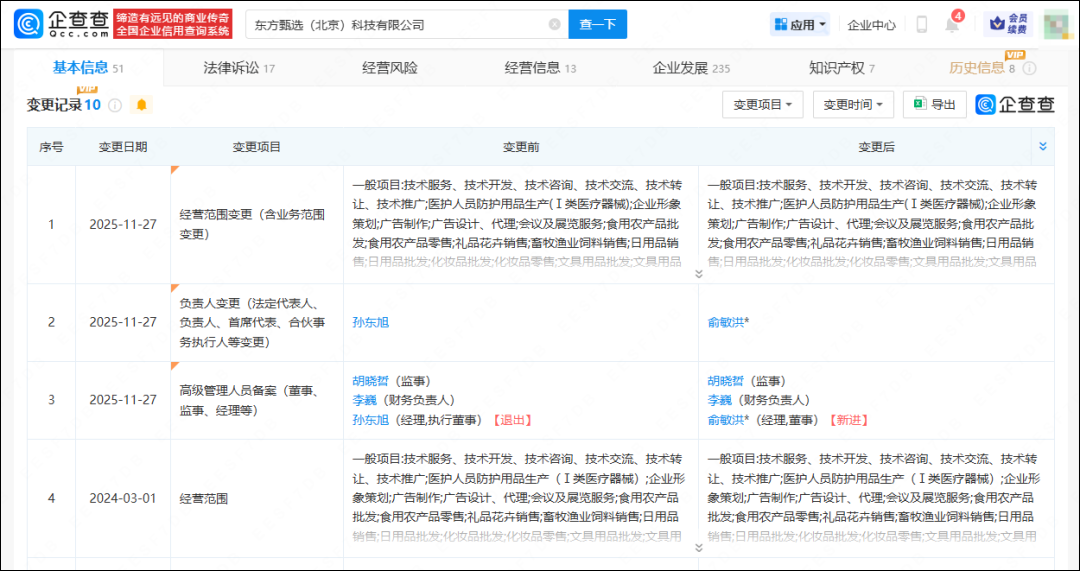 12月1日,企查查APP显示,近日,东方甄选(北京)科技有限公司发生工商变更,孙东旭卸任法定代表人、经理、执行董事职务,由俞敏洪接任。