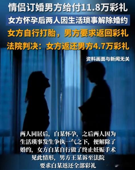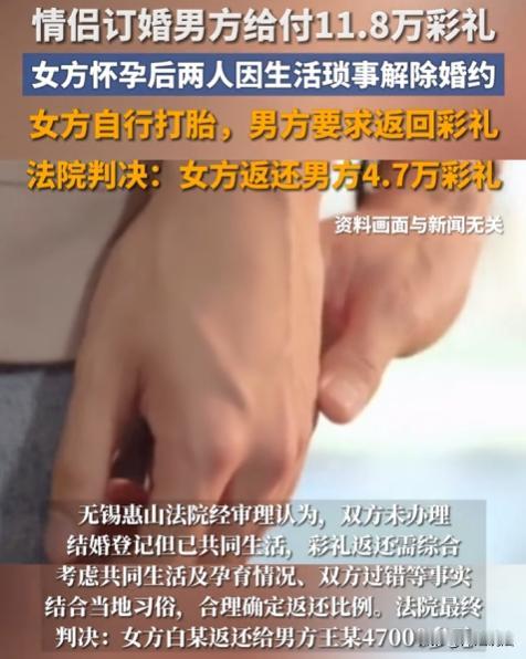 江苏无锡,王某和白某订下婚约,王某给了11.8万元彩礼,之后两人开始同居,白某还怀了孕,后来因为生活里的一些小事,两人起了争执,一气之下就解除了婚约,白某自己去做了终止妊娠,王某觉得彩礼不能白给,就把白某告上法院,要求把11.8万元彩礼全要回来。 王某和白某本来都走到订婚这一步了,还给了11.8万彩礼,两人也同居了,白某还怀了孕,这眼看就要组成一个幸福的小家庭了。 可谁能想到,就因为生活里那些鸡毛蒜皮的小事,两人吵得不可开交,一气之下就解除了婚约。 王某觉得这彩礼不能白给,就跑到法院,要求白某把11.8万彩礼全还回来。 白某觉得两人都同居了,自己也怀孕了,这彩礼哪能说还就全还。 而且这终止妊娠,对自己的身体伤害也很大,精神上也受了不小的打击。 她觉得王某不能这么不讲道理,这彩礼不应该全额返还。 这事的争议点很明确,就是这彩礼到底该不该全额返还。 王某觉得,既然婚约都解除了,那彩礼就得全还回来,这是天经地义的事。 白某可不这么想,她觉得两人已经共同生活了,自己还怀孕了,这彩礼不能全还。 而且终止妊娠手术对自己伤害很大,这精神损失也得考虑进去。 从法律依据来说,民法典婚姻家庭编司法解释规定,双方未办理结婚登记手续,请求返还按照习俗给付的彩礼的,应当予以支持。 但这里有个但书,就是如果双方未办理结婚登记手续,但已共同生活,女方有终止妊娠等情形的,会根据实际情况,酌情确定是否返还以及返还的比例。 王某和白某确实没办理结婚登记手续,按照法律规定,王某有权要求返还彩礼。 但两人已经共同生活了,而且白某还怀孕了,后来做了终止妊娠手术。 这些情况都得考虑进去,不能简单地说全额返还。 问题来了,这彩礼到底该怎么返还才合理呢? 是全额返还,还是部分返还?返还多少才合适呢? 《民法典》规定,处理彩礼返还问题,要尊重当地习俗,同时要考虑双方共同生活的时间、是否生育子女、彩礼数额、彩礼使用情况等因素。 王某和白某订婚后就同居了,虽然没领结婚证,但一起生活了一段时间。 这段时间里,两人肯定有一些共同的生活开销,这彩礼可能也用了一部分在共同生活上。 白某怀孕了,后来做了终止妊娠。 这对她身体和精神都有很大影响,这损失也得考虑进去。 而且孕育子女,对家庭来说也是一件大事,这彩礼返还也不能不考虑这个因素。 还有这当地习俗,不同地方对彩礼返还的规定可能不一样。 在判决的时候,也会参考当地的习俗,看看大家一般都是怎么处理这种情况的。 综合以上因素,法院认为,王某和白某未办结婚登记但已共同生活,且女方有妊娠经历,仅因未登记要求全额返还彩礼有违公平原则。 最终 ,法院判决白某返还王某47000余元。 为什么不是全额返还呢? 这是因为虽然两人没领结婚证,但已经共同生活了,而且女方有妊娠经历,这对女方来说损失很大。 如果全额返还彩礼,对女方不公平。 综合考虑了这些因素,才确定了这个返还比例。 如果女方没有终止妊娠,这返还比例会不会不一样呢? 如果女方生育了子女,那彩礼返还的比例可能会更低。 因为生育子女对女方身体和精神影响更大,而且对家庭贡献也更大。 现在很多年轻人,没领结婚证就先同居了,有的还怀孕了。 可一旦因为一些小事闹矛盾,就可能解除婚约。 这时候,彩礼返还问题就成了个大难题。 在处理感情问题的时候,一定要理性。 不能因为一时冲动,就做出让自己后悔的事。 而且,在涉及彩礼等经济问题的时候,一定要提前商量好,避免以后产生纠纷。 (信息来源: 女子婚前同居怀孕,退婚后男方起诉返还11.8万元彩礼,法院:仅因未登记要求全额返还彩礼有违公平原则 2025-11-30 22:34·红星新闻)