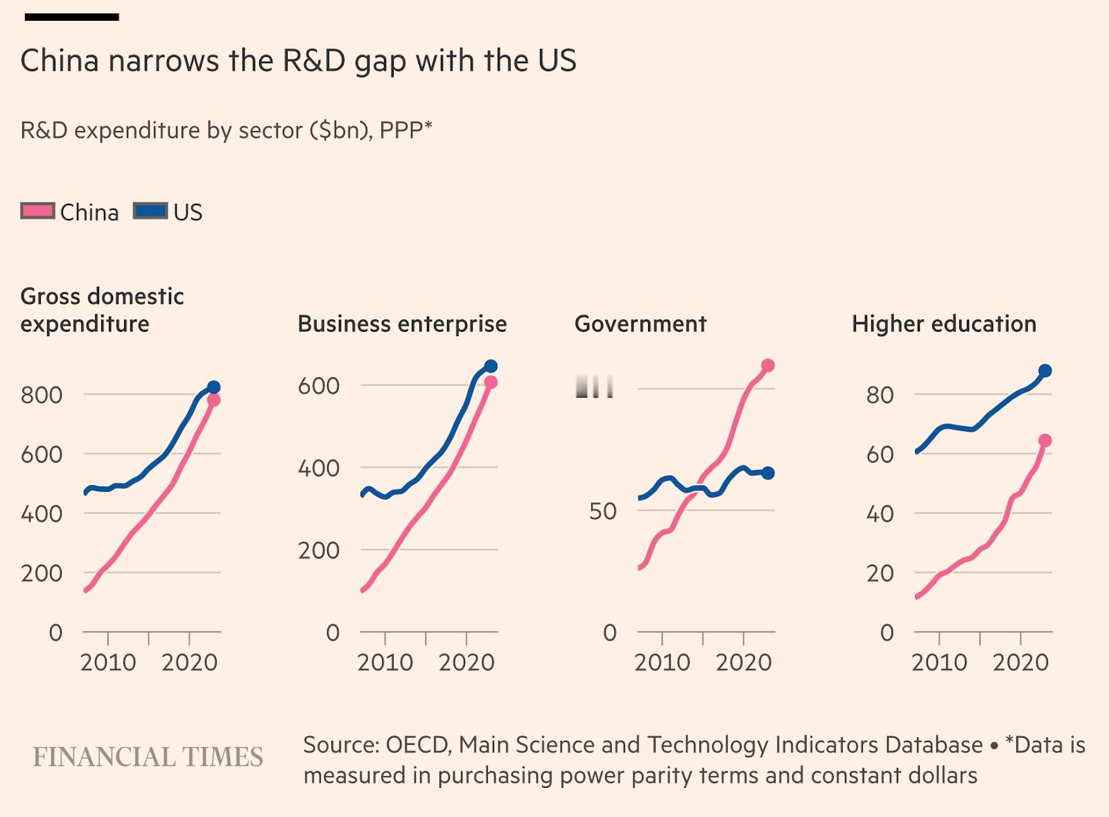 FT: 中国是否在赢得创新竞赛?感觉文章有价值的是提出问题,“西方多年来关于中国国家主导发展模式是否明智的辩论,证据显示大量国家资金因补贴和腐败而浪费,以及对中国学术研究和专利质量的批评。”这文章提供了大量证据,说明贬低中国创新的观察是不对的。有了这个研究方向,再去找证据就随便了,到处是。总量上,OECD数据,中国研发总支出快超过美国了。2023年中国投入7810亿美元,美国为8230亿美元。2007年中国研发支出1360亿美元,不到美国4620亿美元的三分之一。上海外资研发中心数量已从2018年的441个增加到631个。法国雷诺甚至不在中国销售汽车,但今年在上海开设研发中心。北京今年前10个月内新建了58个外国研发中心,总数扩大到279个。外国公司必须来中国,利用良好的创新环境。搞汽车研发不来中国,就是搞笑了。