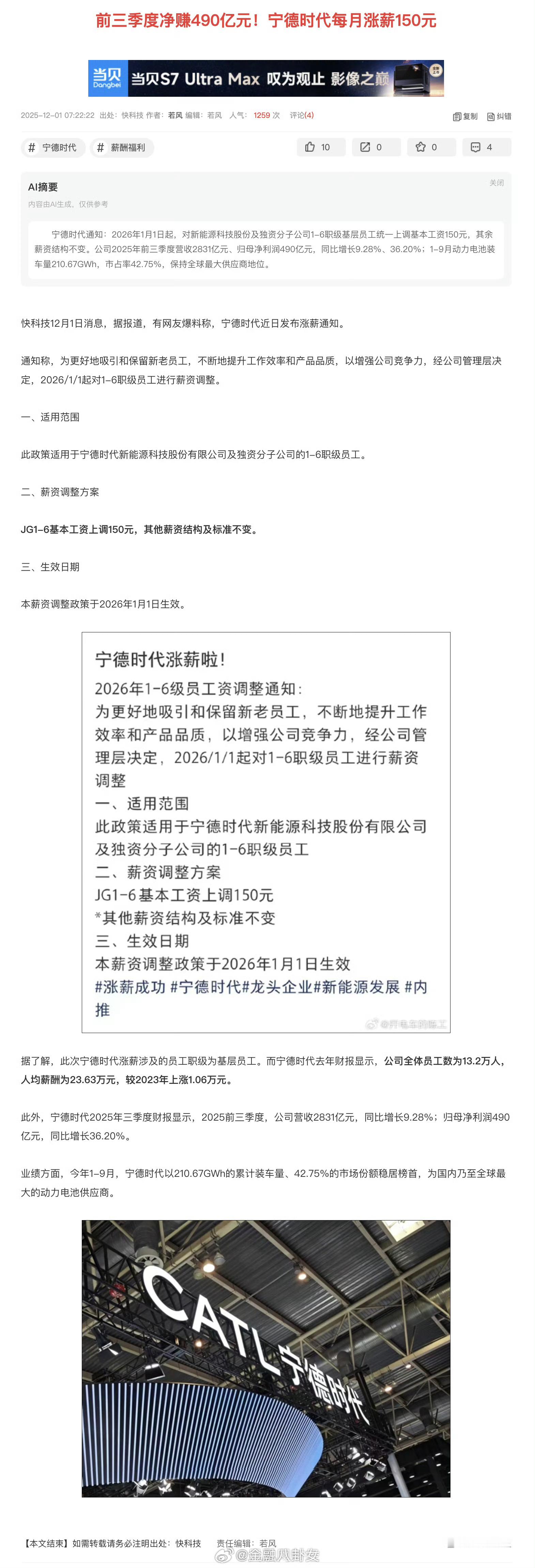 前三季度净赚490亿元!宁德时代每月涨薪150元。宁德时代去年财报显示,公司全体