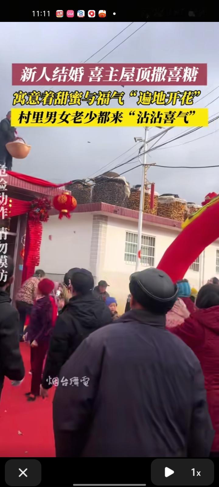 11月29日,烟台莱阳市。新人结婚,喜主站在屋顶上撒喜糖,村里男女老少都来沾沾喜气。撒喜糖寓意是甜蜜与夫福气,就像糖果一样遍地开花,农村办婚礼就是热闹。