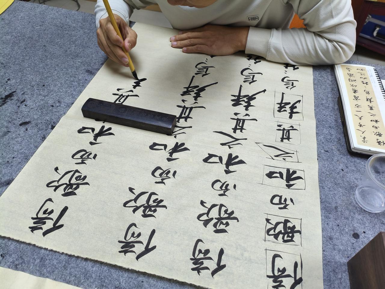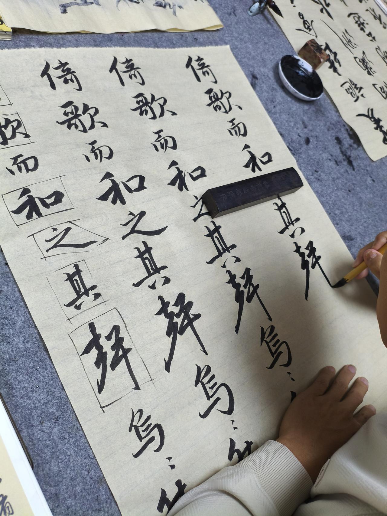 【学员学书记录】 从单字精准临摹转入单行章法临摹。 在把单字写准的基础上,去写一行字。学习上下字之间的关系,从而完成单行字的章法学习。