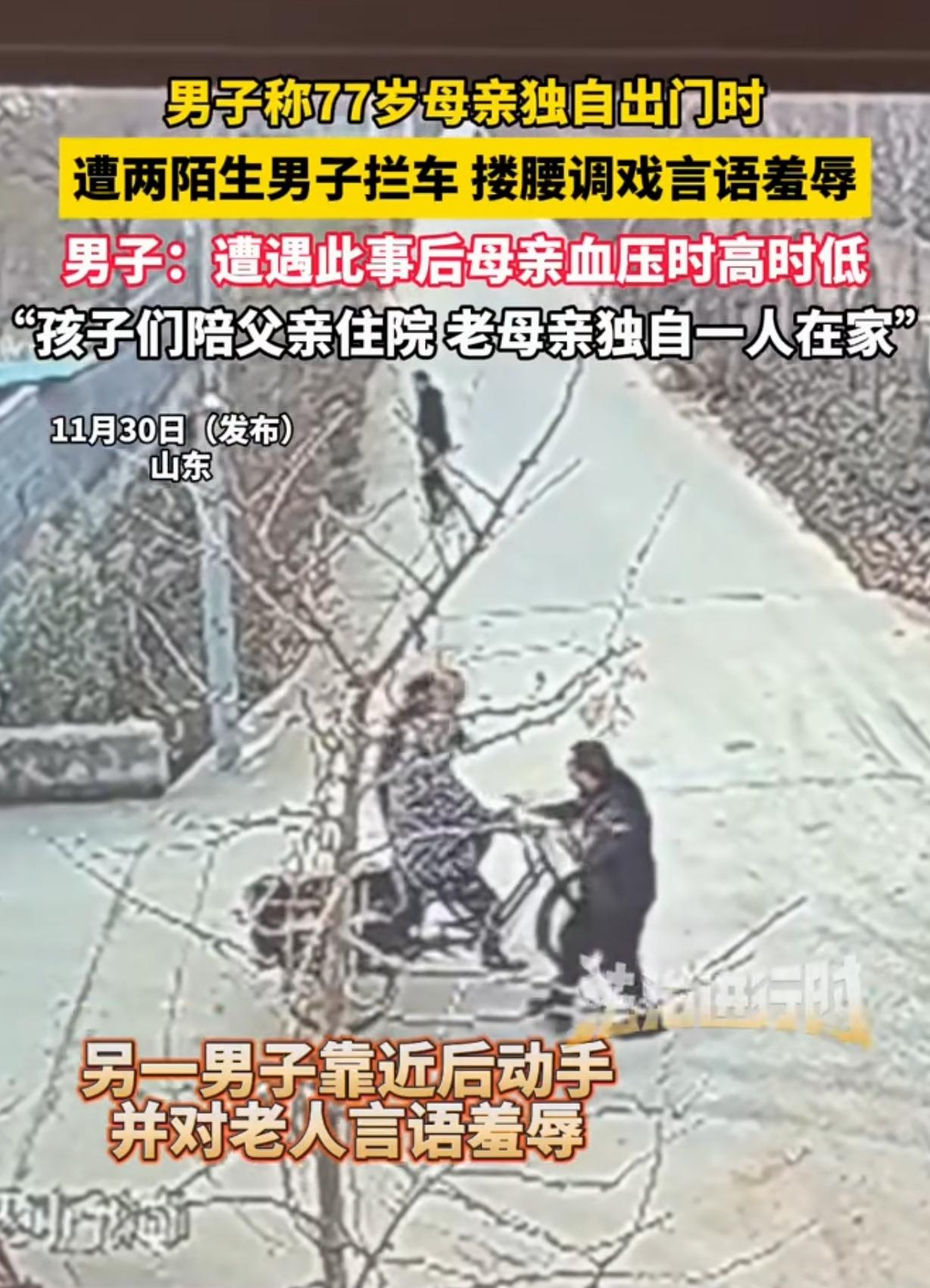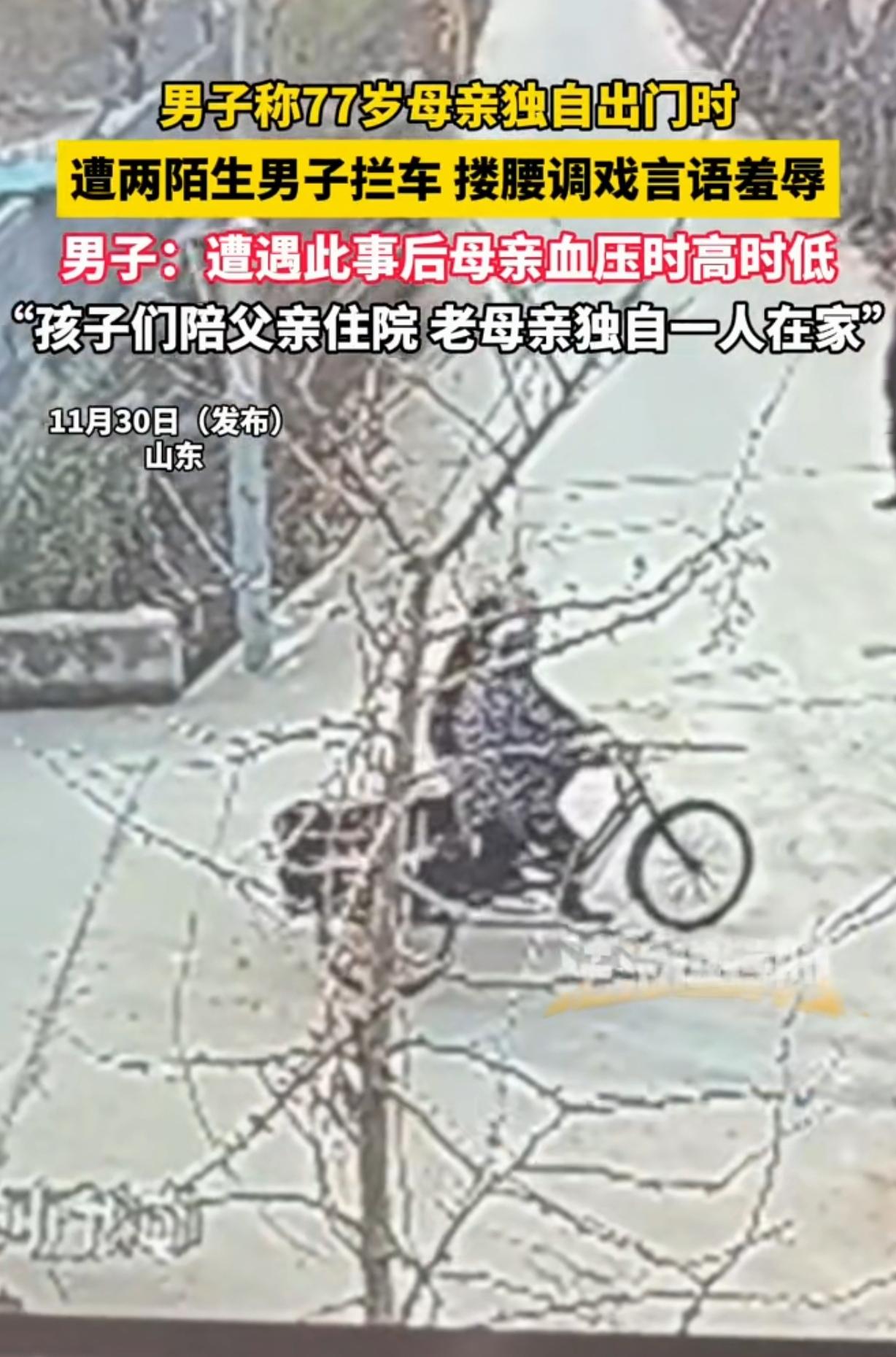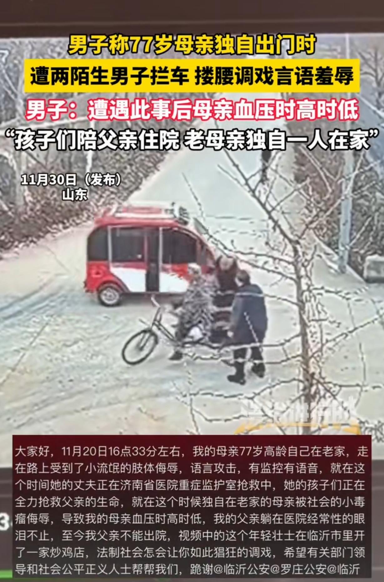“道德何在?”山东临沂,一77岁大妈骑三轮车出门,突然冒出2个年轻力壮的男子,拦住大妈的车,对大妈动手动脚,搂腰调戏,言语侮辱,而此时,大妈的老伴正在医院抢救,儿女们都在医院陪护,事后,受辱的大妈急火攻心,血压忽高忽低,儿子查看事发路段监控后火冒三丈,他经过调查,发现其中一个男子,是一家炒鸡店老板。 202511月20日,下午4点33分,寒风凛冽,一大妈穿的厚厚的,骑着三轮车出门。 以前的家里,儿孙绕膝,热闹不已,可如今就剩大妈一人在家了,她抓心挠肝,才决定骑三轮车出去溜达一圈,否则度日如年。 因为,大妈的老伴突发重病,正在济南的大医院抢救,儿女们都陪在医院。 大妈也想跟着去,可她毕竟77岁高龄了,儿女们怕父亲有个三长两短,母亲承受不了打击,就安排她在家看家。 可大妈身在曹营心在汉,在家里急得像热锅上的蚂蚁,每天坐立不安,夜不能寐提心吊胆。 她和老伴相濡以沫几十年,生儿育女,很少吵架拌嘴,都说少年夫妻老来伴,她不能想象,如果老伴先走一步,她如何度过孤独的余生,只能每天在心里祈祷,希望老伴能挺过去。 这天,大妈骑着三轮车出门溜达,看看风景,遇到熟人说说话,转移一下注意力,时间还好打发一些。 可万万没想到,突然有个陌生男子向大妈走来,伸手拦住了她的三轮车,让大妈瞠目结舌的是,男子竟然搂腰调大妈。 大妈真是大跌眼镜,自己又不是个年轻美女,一把年纪的人了,甚至比男子母亲的年纪都大,他怎么能对自己这么不尊重? 可事情远没有结束,不大会,又跑来一个男子,对大妈言语羞辱。 大妈本来心情就不好,被他们如此对待,真是急火攻心,大声怒斥。 这时,后面开过来一个电动三轮车,大妈趁机甩脱两个男子,骑车离开。 两个男子也没穷追不舍,然后嬉皮笑脸结伴离开。 事后,大妈把这件事告诉了在济南医院的儿子,儿子一查看监控,气的火冒三丈,监控里有语音,看到母亲古稀之年,竟然遭遇了这样的事,儿子愤怒不已。 他经过调查,发现其中一男子,是一家炒鸡店老板。 而事后,母亲气不过,血压忽高忽低,父亲还没脱离危险,也经常泪流不止,可干着急也出不了院。 这事儿听着真让人又生气又心疼!77岁的大妈,本该是儿孙绕膝、安享晚年的时候,却因为老伴突发重病,儿女们都在医院守着,自己孤零零留在家里。 她心里急得像热锅上的蚂蚁,想出去散散心,结果倒好,碰上俩没长心的年轻男子,一个动手动脚搂腰调戏,一个言语羞辱,这哪是人干的事儿啊? 你说这俩男的,是不是脑子进水了?大妈都一把年纪了,比你们妈岁数都大,咋能下得去手?就算心里有啥不痛快,也不能拿个老人撒气啊!这不仅仅是没素质,简直就是缺德! 大妈被这么一折腾,急火攻心,血压忽高忽低,老伴还在医院躺着,她心里得多难受啊!儿女们知道了,肯定也气得不行,一边是父亲生死未卜,一边是母亲受此屈辱,这日子咋就这么难呢? 我觉得,这俩男的真该好好反思反思,做人得有底线,得讲道德!你欺负个老人,算啥本事?有能耐你去干点正事儿,别整天游手好闲,净干些缺德事儿! 这事儿也提醒咱们,得加强点道德教育,别让这种事儿再发生了。咱们得尊老爱幼,这是咱们的传统美德,不能丢! 希望大妈能快点好起来,老伴也能挺过这一关,一家人平平安安的,比啥都强!也希望那俩男的能受到应有的惩罚,长长记性,别再干这种伤天害理的事儿了! 2名年轻男子对77岁大妈实施搂腰调戏、言语侮辱的行为,涉嫌违反《刑法》第237条关于“强制猥亵、侮辱罪”的规定。 该条款明确:以暴力、胁迫或其他方法强制猥亵他人或侮辱妇女的,处五年以下有期徒刑或拘役;聚众或在公共场所当众实施前述行为,或有其他恶劣情节的,处五年以上有期徒刑。猥亵儿童的,从重处罚。 从行为定性看,2名男子虽没直接使用暴力手段,但通过拦截车辆、肢体接触搂腰,及言语羞辱等方式,对大妈实施了具有强制性的猥亵与侮辱行为。 大妈因老伴重病、独自留守,本就处于心理脆弱状态,二人的行为不仅侵犯其身体自主权,更对其人格尊严造成严重伤害,符合“强制猥亵、侮辱”的构成要件。 从情节严重性看,本案存在3重加重情节:其一,对象特殊,受害者为77岁高龄老人,属于法律重点保护的弱势群体;其二,场所公开,行为发生在公共道路,具有“当众”性质;其三,后果严重,大妈因受辱急火攻心导致血压波动,其老伴亦因情绪激动病情加重,家庭陷入双重危机。 此类情节恶劣的案件,量刑幅度通常在五年以上有期徒刑。 此外,如果调查证实其中一名男子作为炒鸡店老板,利用经营场所或社会身份实施犯罪,可能进一步构成“在公共场所当众实施”的加重情节。 法律对老年人权益的保护不容侵犯,本案不仅需追究行为人刑事责任,更应通过严惩传递“尊老不可逾越”的信号。 关注@灋律盐究员 学法辩是非,用法止纷争。