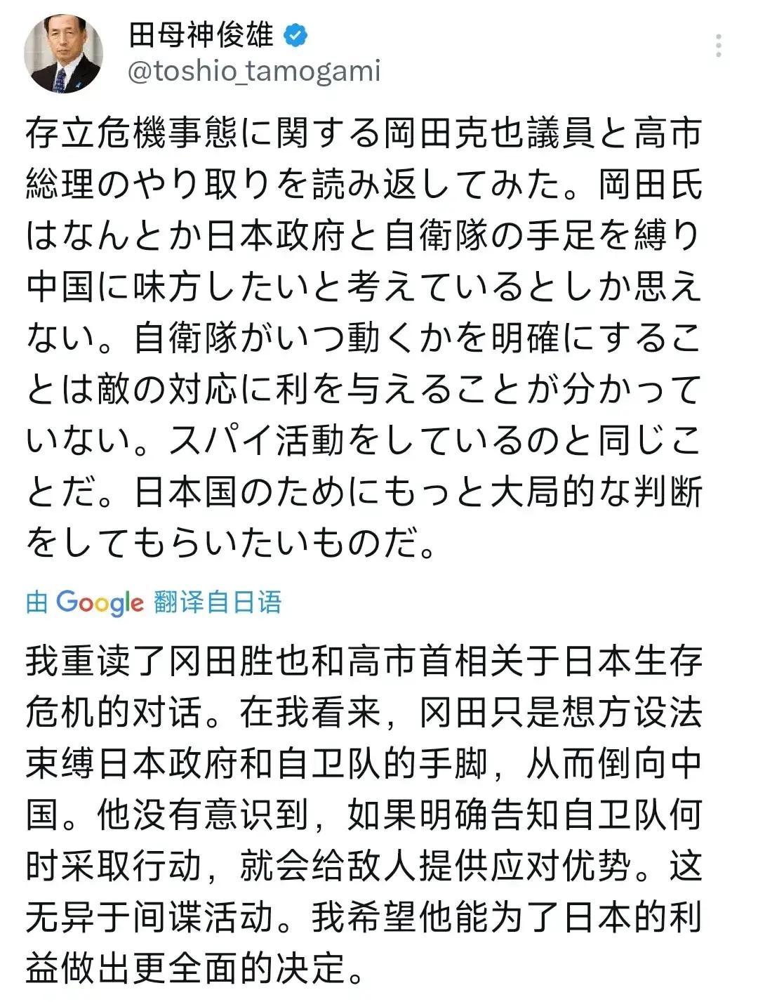 快讯!快讯! 把国会质询扣上“间谍”的帽子,不是维护安全,是把监督当敌人。日本这两年外交的尴尬,并不源于有人问了几句,而是有人靠煽动抢话筒。直白一点说:如果靠喊硬话就能护国,为什么军费年年涨、风险却更高? 冈田的问题针对的是“何时、以何依据、由谁决策”,这是民主国家的安全阀。把“明确行动规则”偷换成“公布作战时机”,逻辑上就是混淆概念。法律框架与作战细节是两码事:前者防止权力越线、避免政治冲动绑架军队;后者当然保密。红线清晰,反而能降低误判,让对手知道越线要付出代价。 “束缚政府”“倒向中国”这类扣帽子,听着痛快,用起来轻飘。现实是,极右翼把台海当国内政争的燃料,结果是把自己的外交空间越挤越窄。田母神把矛头指向冈田,本质是替高市早苗的激进言论找台阶。她一句话把局势推高,日本在盟友面前也难解释:到底是理性伙伴,还是情绪驱动的邻居? 别把安全议题想成口水仗。对我们普通家庭而言,战争不是新闻,是汇率、物价、订单和养老金的真实压力。姿态强硬不等于安全加分,很多时候先买单的是工薪层。战略稳健不等于软弱,克制才是成熟国家的肌肉。 看看惯例:美国会在国会公开授权框架,但不会公开具体行动节奏;透明与机密并行不悖。日本也需要可预期的政策,而不是靠某些人的激情发言定方向。 我的态度很明确:台海问题,理性与冷静是唯一选项。让军队在法律边界内行动,让外交在多边场发声,别被极右翼的噪音牵着走。把监督叫成“间谍”,只会让政策更粗糙、风险更高。日本如果继续被情绪绑架,最后受伤的不是政客的面子,而是每个普通人的钱包和孩子的未来。