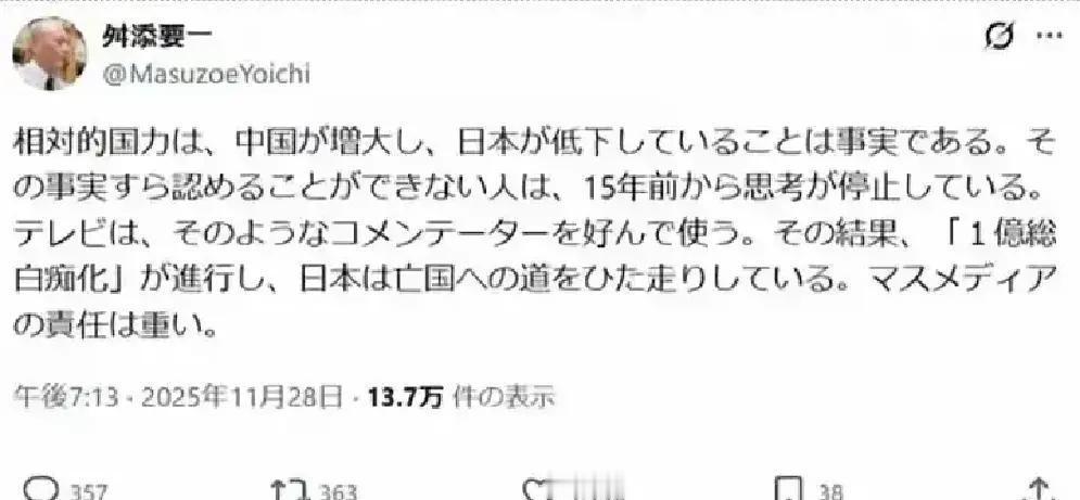 果不其然。 日本前东京都知事舛添要一突然发文了。 他这次在11月28日的推特上掷地有声:中强日弱是摆在桌面上的现实,差距还会拉大;日本媒体却活在很多年前的镜头里,用陈旧偏见看邻居,最后甩下一句“日本正在亡国之路上狂奔”。别急着把他当“杠精”。舛添要一不只是前知事,还当过厚生劳动大臣,长期关注安全与财政,嘴上重一点,但并非空话。 顺着“中强日弱”这句,我们先看硬指标。公开预算显示,日本已把防务开支拉到每年约8万亿日元,并规划2023—2027五年投入约43万亿日元,目标到2027年接近GDP的2%。装备上也在发力:两艘“出云”级航母改装F-35B,F-35总采购规模预估达百余架;岸舰用12式反舰导弹升级射程,远程打击能力一步步补;还下单了约400枚“战斧”。但对面是怎样的节奏?中国海军战斗舰艇数量已是全球第一,至少6艘055型大驱入列,3艘航空母舰里两艘服役、一艘(福建舰)海试推进。就像一个年级里,有人每天加练两小时,你这边刚把课程表补齐,差距是实打实的。 把镜头拉到造船台更直观。日本曾是商船与军舰的金字招牌,但民用船厂这十多年收缩明显,自卫队的新一代护卫舰“最上”级计划12艘,节奏稳但不快;而中国的052D、054A等批量化生产能力强,年均下水数长期维持高位。拿韩国作参照,KDX-III(二批)也在往更大更强的驱逐舰走,日本并非没有追,但工业底层的产能、供应链韧性,决定了你能不能“连轴转”。这不是多花钱就秒变的事,更像你家厨房:有单子、有预算,但炉子火候、配菜速度、师傅手艺都要跟得上。 再看人。日本自卫队近年招募未达满额是官方承认的老问题,少子化、老龄化让部队年轻兵员越来越紧缺,只能从提高女性比例、延长服役、增设技术岗去补。对比韩国的义务兵制与庞大基数,或者中国的常态化轮换与高校吸引力,兵源就是长期变量。打比方说,球员少还要打加时赛,再好的战术也要考虑体能,这一点媒体很少正面谈。 按时间线回看,日本原拟部署陆基宙斯盾,2020年叫停,转向两艘“装备宙斯盾系统舰”(ASEV),预计本十年后半段服役;同时加码“反击能力”,这在技术上是必要升级。但现实战场的压力也在升级:反介入环境里,远程弹道与巡航、无人机集群、电子战叠加,要求的是从预警、拦截到再攻击的全链条。看乌克兰战例,弹药产能与工期成了胜负手。日本这边补链、加产是对的,但窗口期并不宽。 说到“亡国”,再把盟友因素摆上台面。日美安保是日本安全的压舱石,第七舰队在西太的存在不是虚的,这点不必自我吓唬。问题在于,过度把心安寄托在“美国一定来”,容易忽略自己的短板。欧洲这两年也学到一课:德国拿出1000亿欧元特别基金,可交付与训练进度仍拖沓。日本同样需要把计划变成螺栓、导线和弹药箱里的实物,把训练时长、后勤库存、维修班组都拉满,而不是停在演播室的BGM里。 所以,舛添要一的重话,像是在提醒日本社会:别再用综艺节目的滤镜看对手。现实是产业和人才的硬差距,是造舰和弹药的节奏差,是媒体自我安慰和一线部队的压力之间的落差。 核心观点就两句:安全靠实力和诚实的镜子,不靠自嗨的叙事。海面上,谁的舰队夜以继日地下水,谁就有话语权;镜头里的打鸡血,挡不住浪。