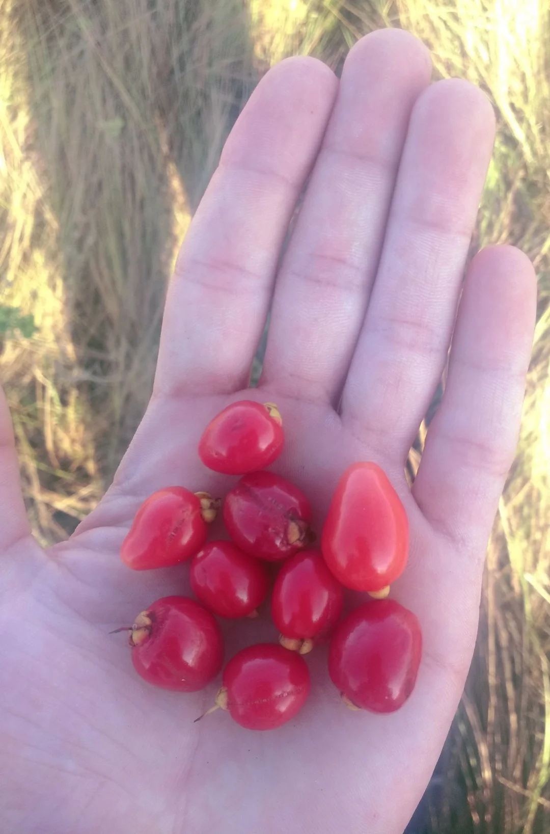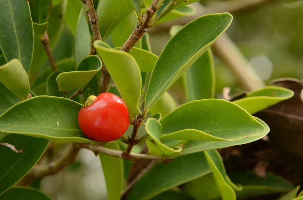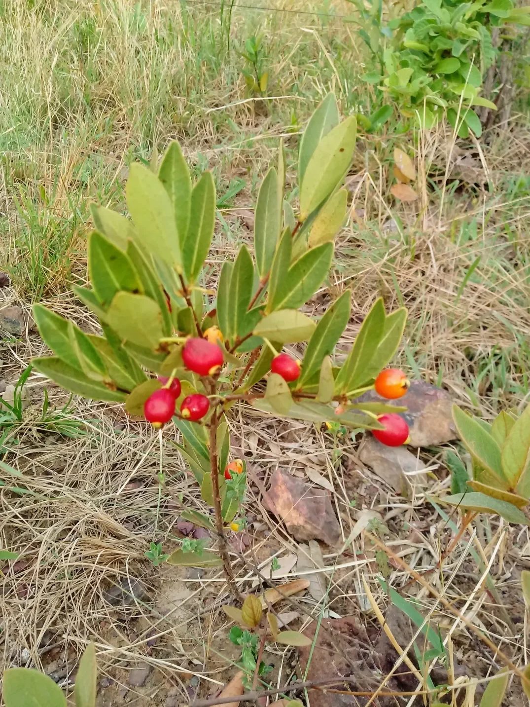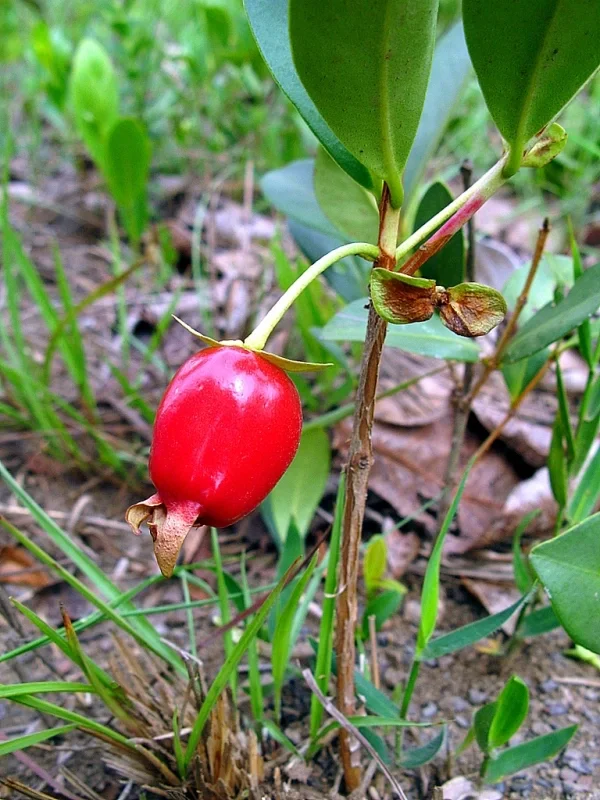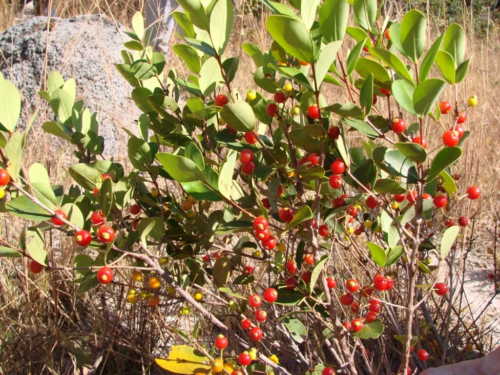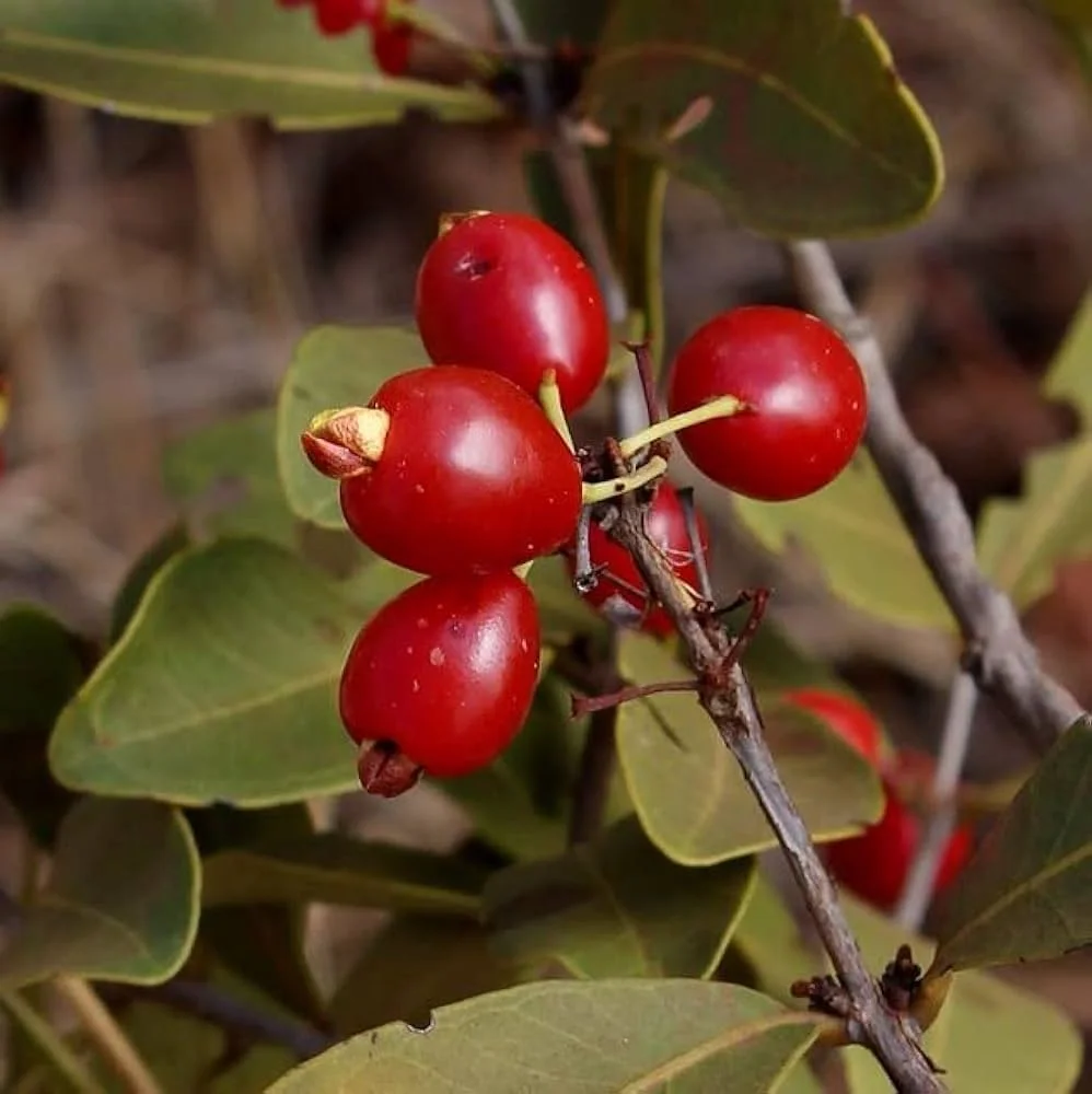 一种健壮分支的灌木,很少到4米高,有细长的树枝,稀疏,圆形到长圆形叶子,白色花、 其次是小而诱人的鲜红色水果,可食用,甜美,略带涩味。 它生长在南美洲海平面至2500米之间的大部分地区以及古巴西部的各种干燥栖息地。 它很适合在热带和温暖地区种植温带的气候,但很少见到。