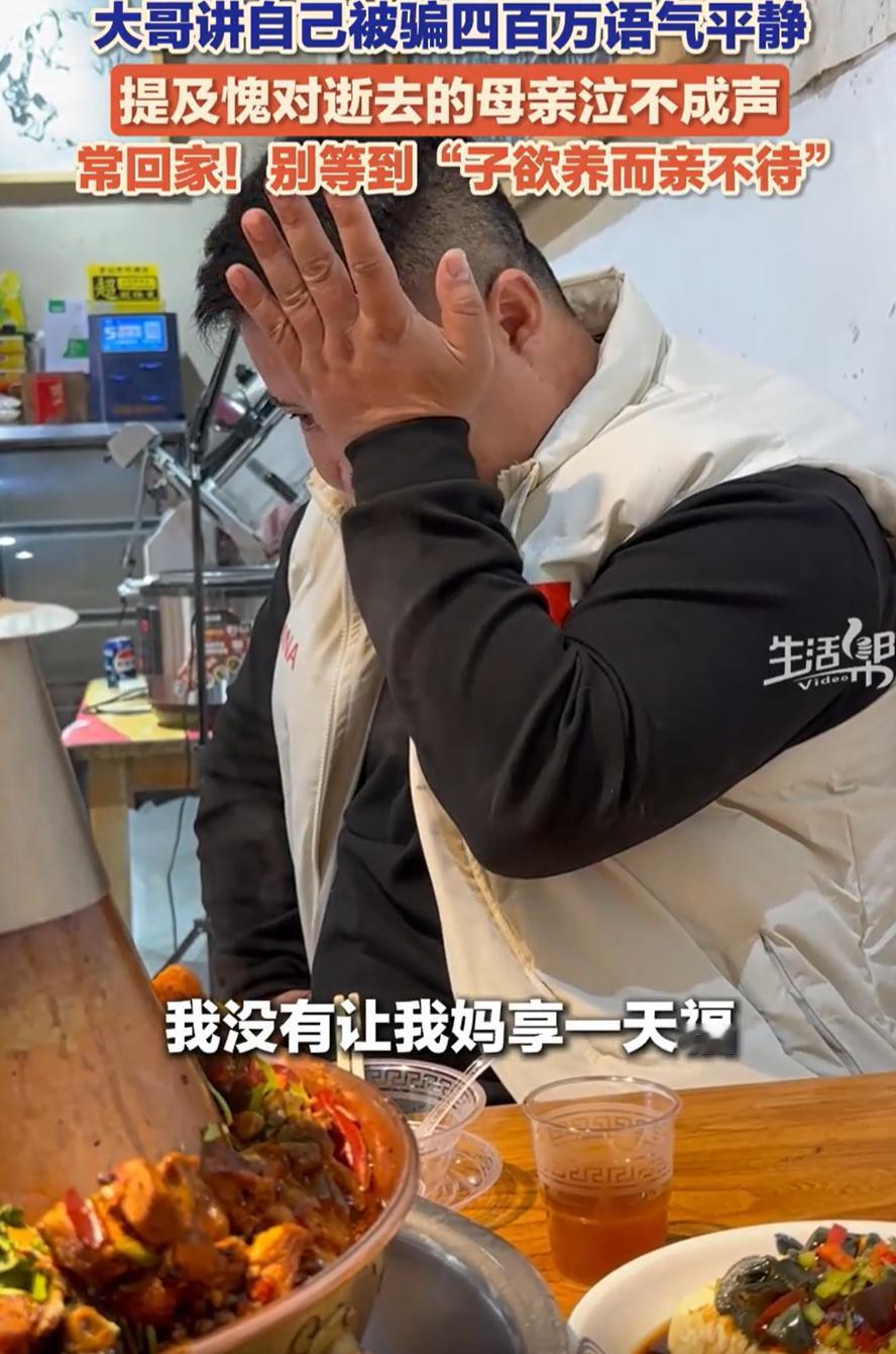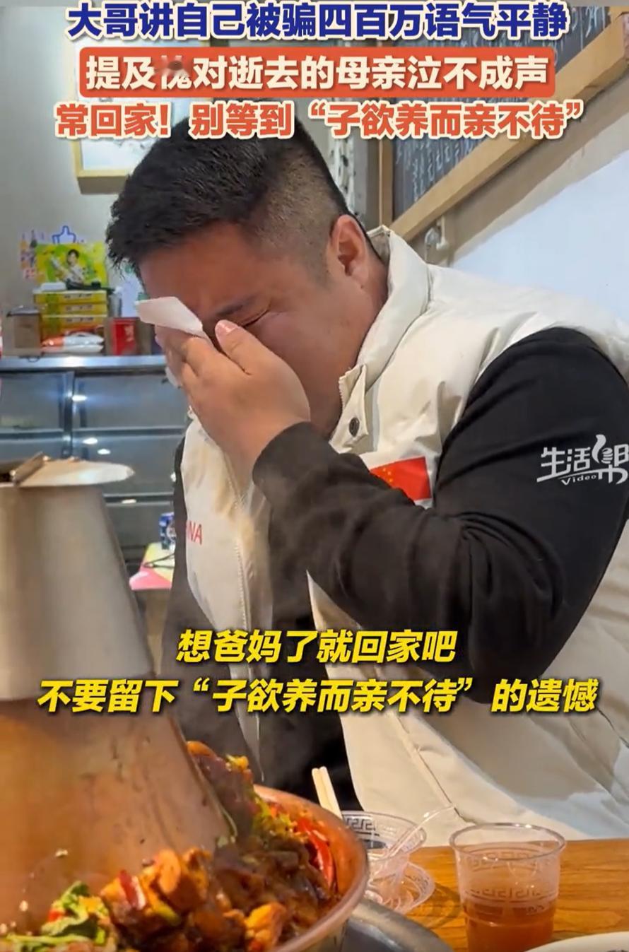 泪目了!山东济南,男子和朋友吃饭聊天,期间他讲起自己干工程时被骗400万的经历,本来还语气平静,可一说到逝去的母亲时,男子突然泣不成声,在他看来,自己没能让母亲享一天福是他最后悔的事情。网友:常回家,别等到“子欲养而亲不待” 视频中,男子提到当时和朋友一起干工程,活干完了,1200万的工程款结给了一位大哥的朋友,但这位朋友却骗他说没结,直到现在还拖着他400多万,始终要不回来 本来在讲述这段经历时,男子表现的还是很淡定的,从外表来看似乎已经开看想透了,可接下来话锋一转,说到了母亲 他说后来母亲查出癌症,他带着母亲去看病,那时候才发现自己连医药费都凑不齐。而且回想起来,以前自己整天忙着做生意,四个孩子全是母亲一手带大的。如今孩子长大了,母亲却病倒了 说到这儿,他声音突然哽住了,眼泪一下子涌了出来。朋友在旁边问,你最想跟母亲说句什么话? 他抹了把脸说:就想告诉她,娘,你儿子是最棒的 这话听着让人心酸。一个中年男人,在外面经历大风大浪都能挺住,可一想到没让母亲享过福,心里的防线就彻底垮了 生活中其实很多这样的人。年轻时候总想着等挣够了钱,等事业稳定了,等孩子长大了,再好好孝顺父母。总觉得来日方长,总觉得以后有的是时间。可等到真的想回头尽孝时,才发现父母已经等不起了 这件事给我的感触是,人可以努力赚钱,也必须努力陪伴。父母不需要我们多厉害,也不靠我们给什么大享受,他们真正在意的,是孩子在身边,有句话说一句,有事说一声。钱赚不完,活也干不完,陪父母的时间却往往只有几年 别等到没机会的时候再说遗憾。哪怕就是打一通电话,哪怕就是回家吃顿饭,都比把心事憋在心里强得多。生活在继续,人也可以慢慢变强,可再强的人,都敌不过一句来不及