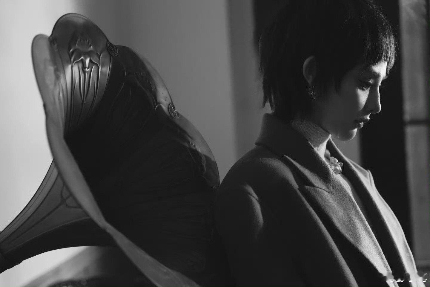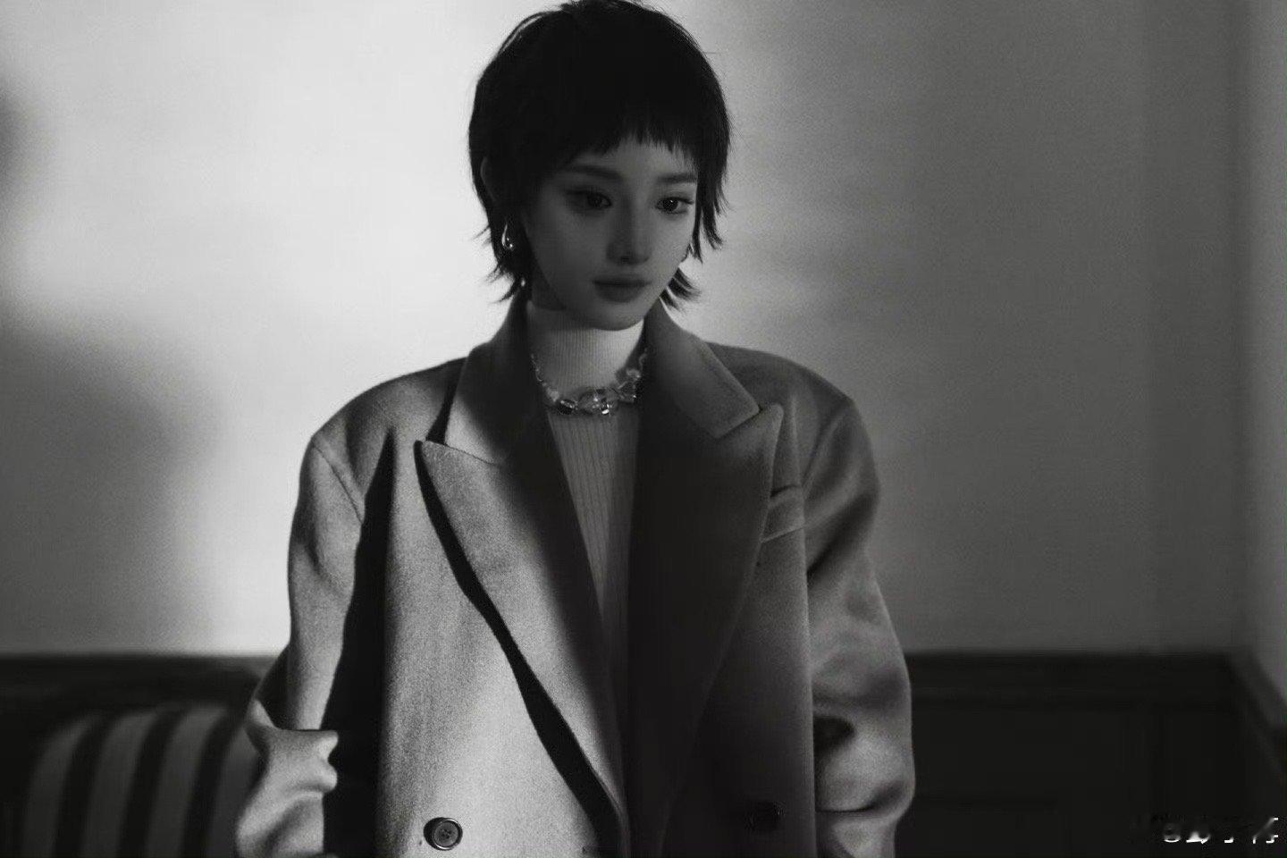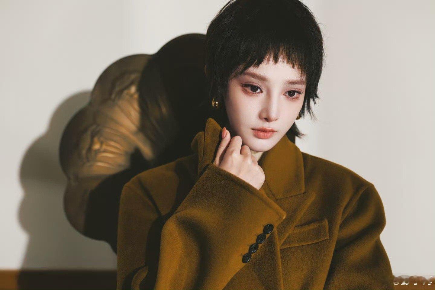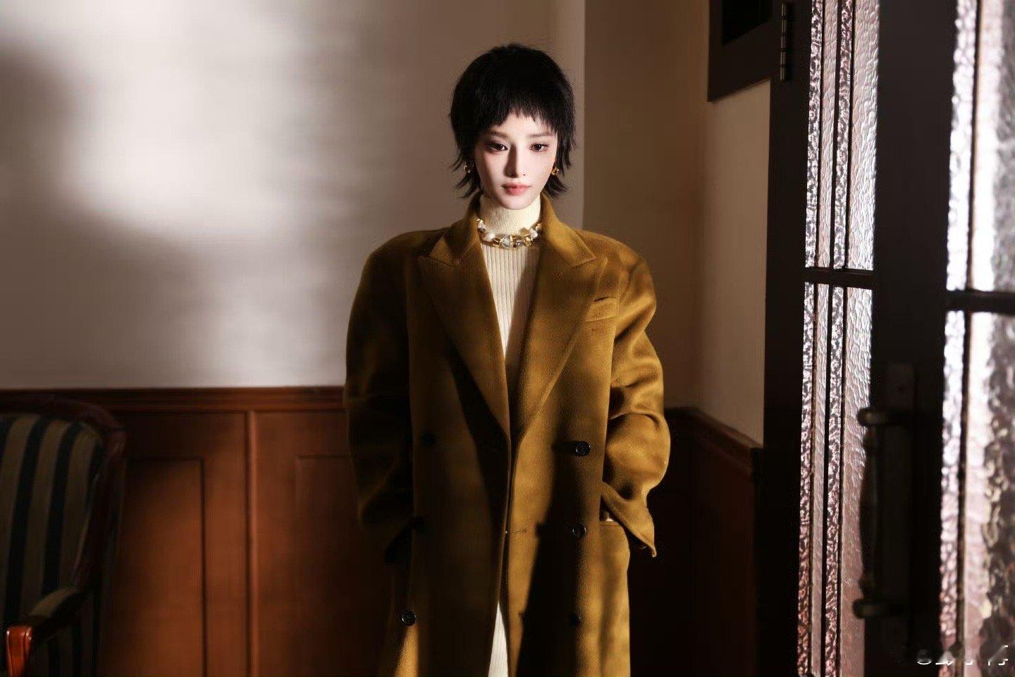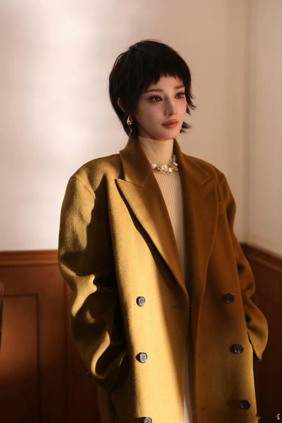 彭小苒焦糖色秋冬氛围杀彭小苒短发质感大片 棕调大衣配短发利落,是把秋冬氛围感揣进